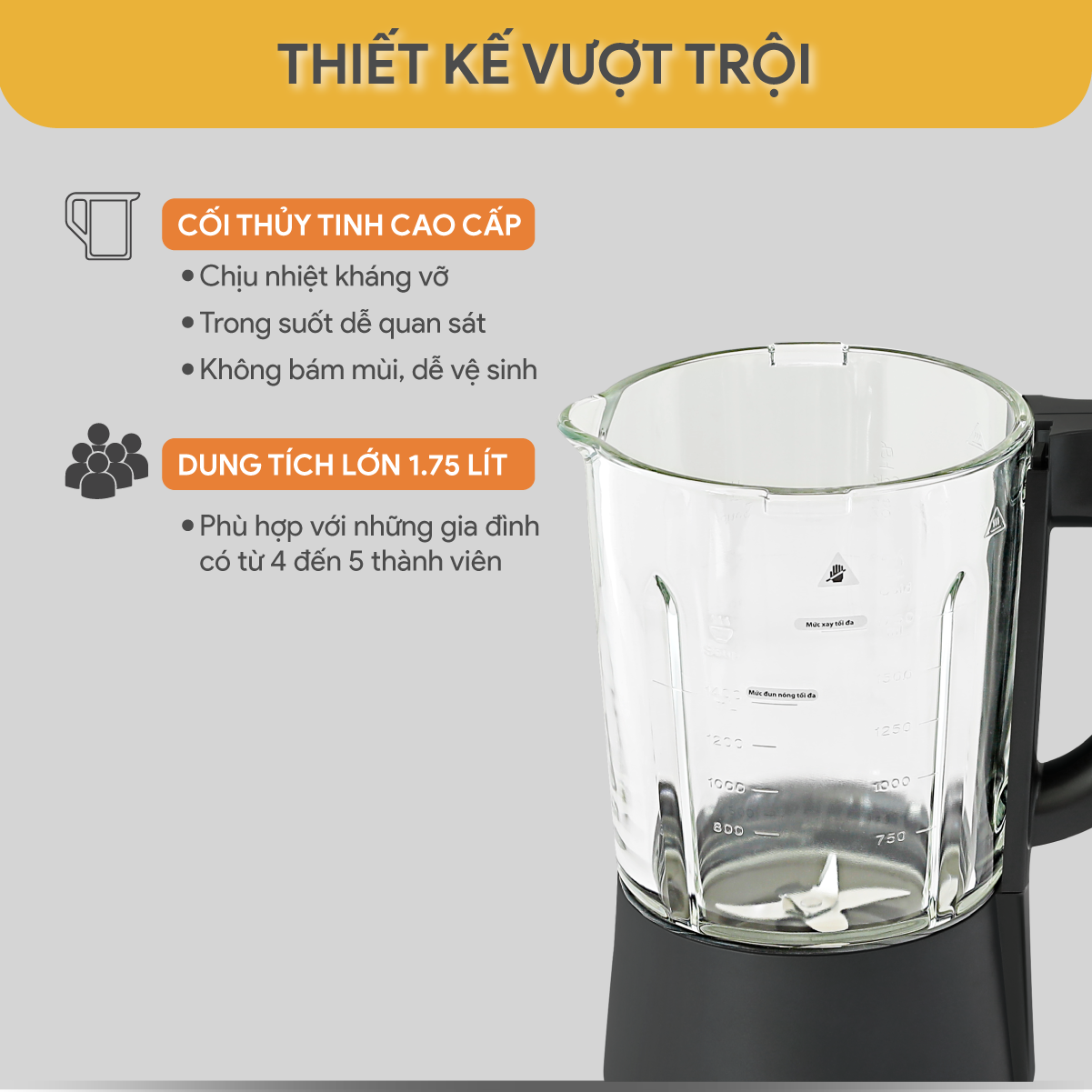 Đặc điểm nổi bật - Máy làm sữa hạt đa năng sử dụng để xay sinh tố, làm sữa hạt các loại, nấu cháo,... - Cối xay thủy tinh cường lực, dung tích 1.75 lít tiện dụng.