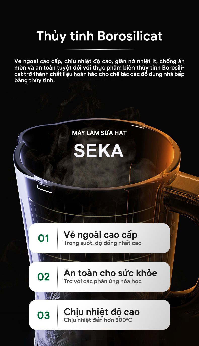 - Danh sách đóng gói: Máy, cốc đo, tay cầm, dây nguồn, công thức nấu ăn, sách hướng dẫn (phiếu bảo hành). Máy làm sữa hạt là một trong những thiết bị cần thiết cho mỗi gia đình, nhất là những chị em có niềm đam mê làm sữa từ các loại hạt. Máy nấu sữa hạt SEKA thông minh, tiện lợi, mang đến cho người nội trợ trợ thủ đắc lực để chế biến thức uống dinh dưỡng thơm ngon và 1 thực đơn đa dạng cho gia đình. Đặc điểm nổi bật của máy làm sữa hạt SEKA: