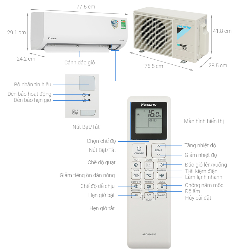 • Kích thước dàn lạnh:Dài 77.5 cm - Cao 29.1 cm - Dày 24.2 cm