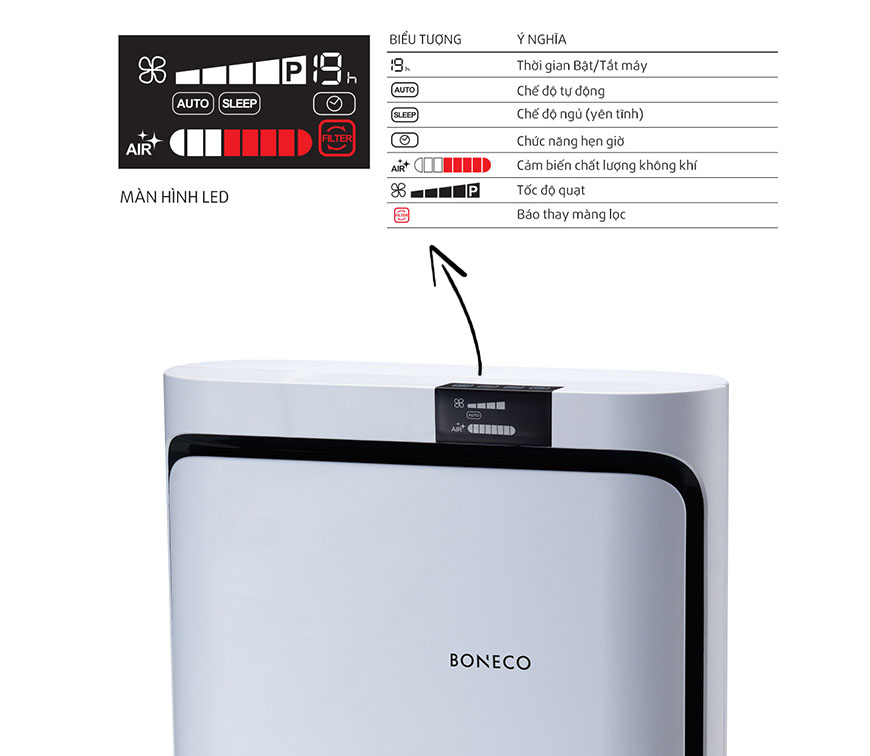 Boneco P500 tích hợp cảm biến chất lượng không khí. Tự động điều chỉnh chế độ lọc không khí phù hợp.