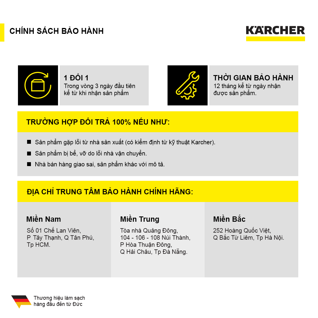 - Với phương châm luôn hướng tới khách hàng. Các sản phẩm khi mua ở Karcher luôn có chế độ bảo hành phù hợp cho khách hàng