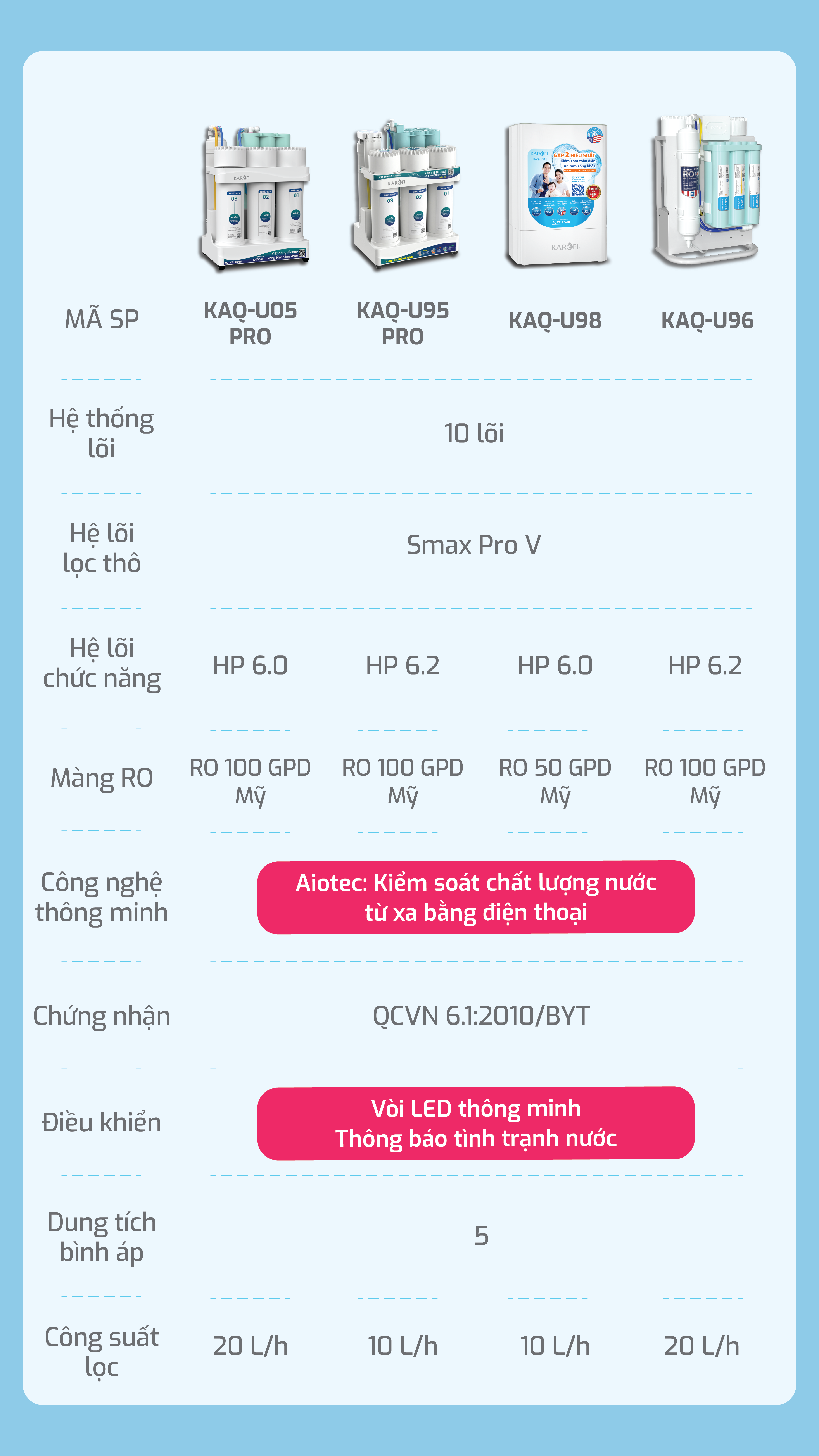 Máy lọc nước để gầm Karofi KAQ-U96 Nhỏ gọn tinh tế - Tiện ích tối đa - Công nghệ thông minh AIoTec - Công nghệ vòi led tiện lợi - 10 lõi lọc Smax mạnh