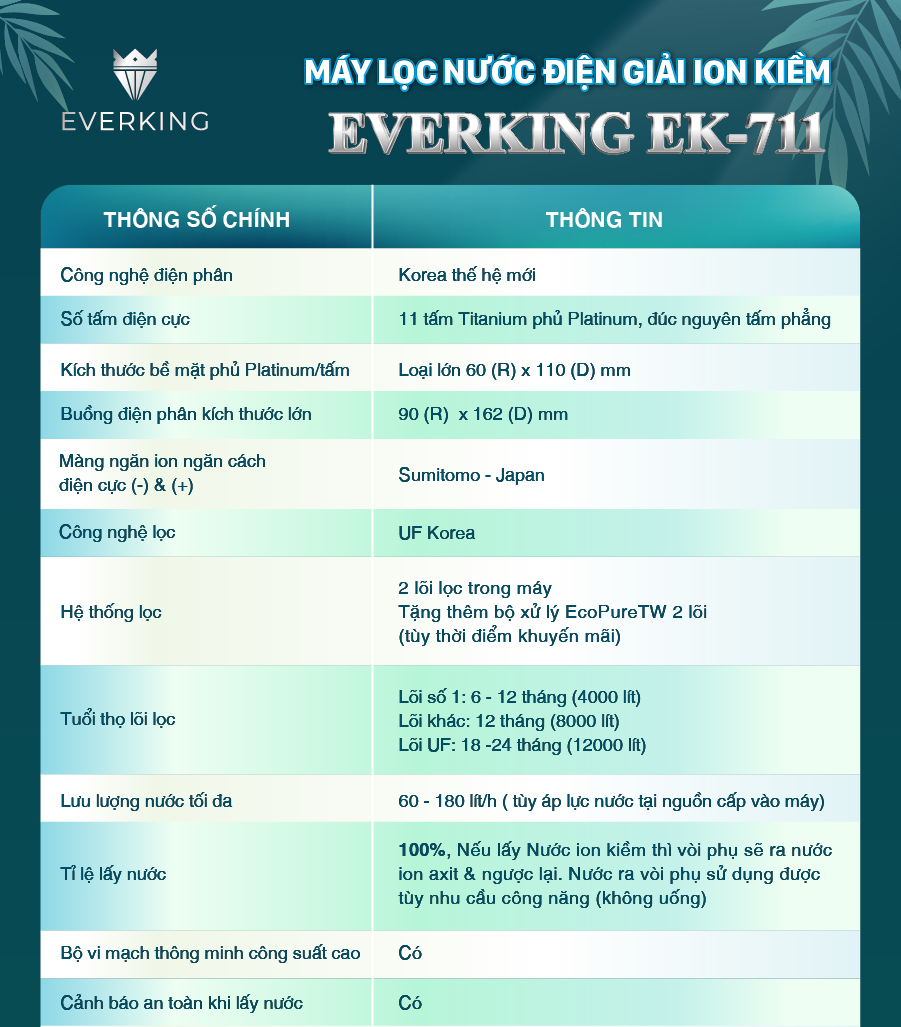 - EVERKING EK-711, được trang bị bộ điện phân 11 tấm điện cực Titanium phủ Platinum nhập khẩu trực tiếp từ Hàn Quốc, bao gồm các tiêu chuẩn: