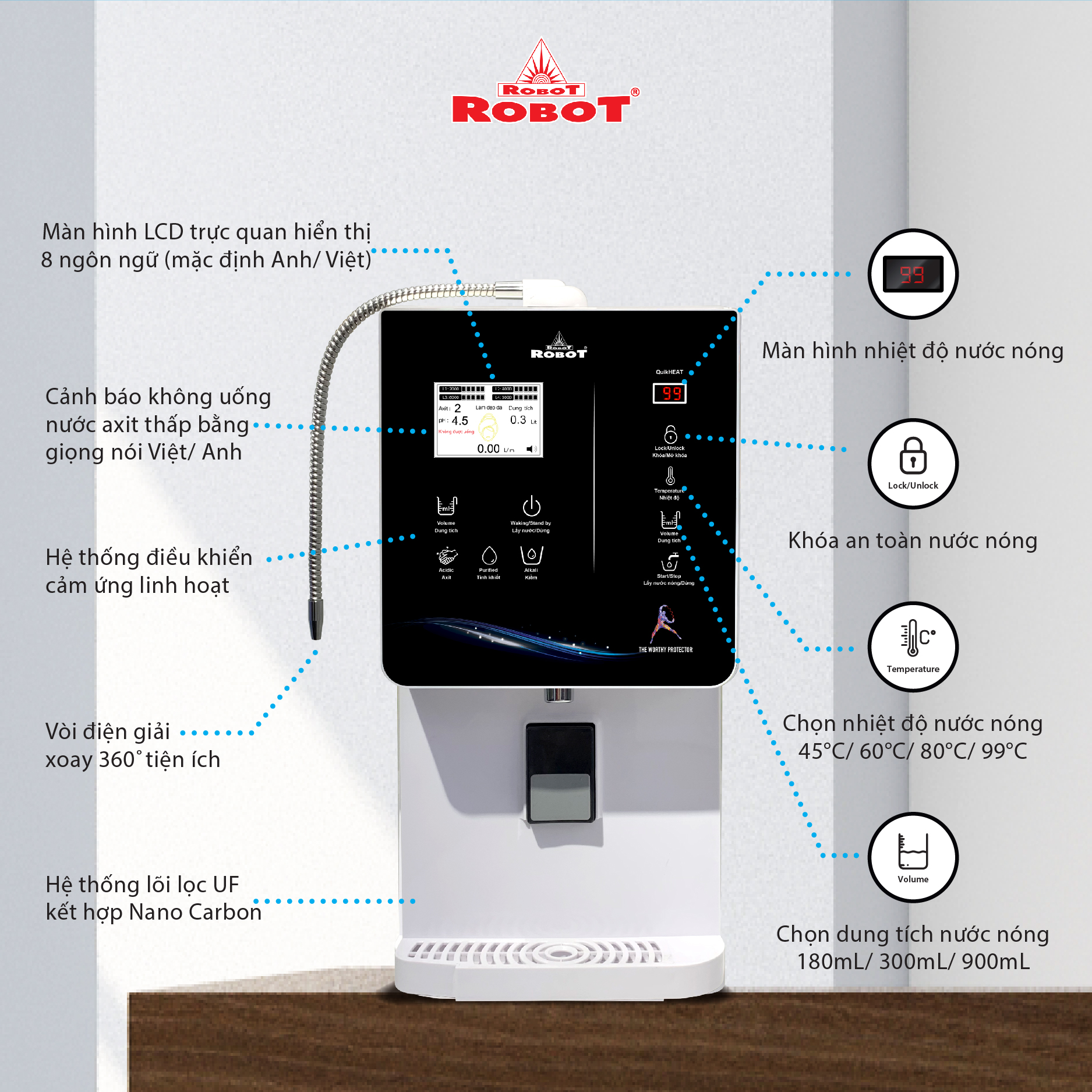 - Máy lọc nước điện giải iON kiềm Nóng Lạnh ROBOT ionQueen là dòng Để Bàn đầu tiên trên thế giới, được thiết kế kiểu dáng hiện đại, thiết kế chinh phục mọi không gian. Đặc biệt, được tích hợp thêm chức năng Nóng Thông Minh – Lạnh độc đáo & duy nhất trên thị trường, mang lại nhiều tiện ích cho người dùng.