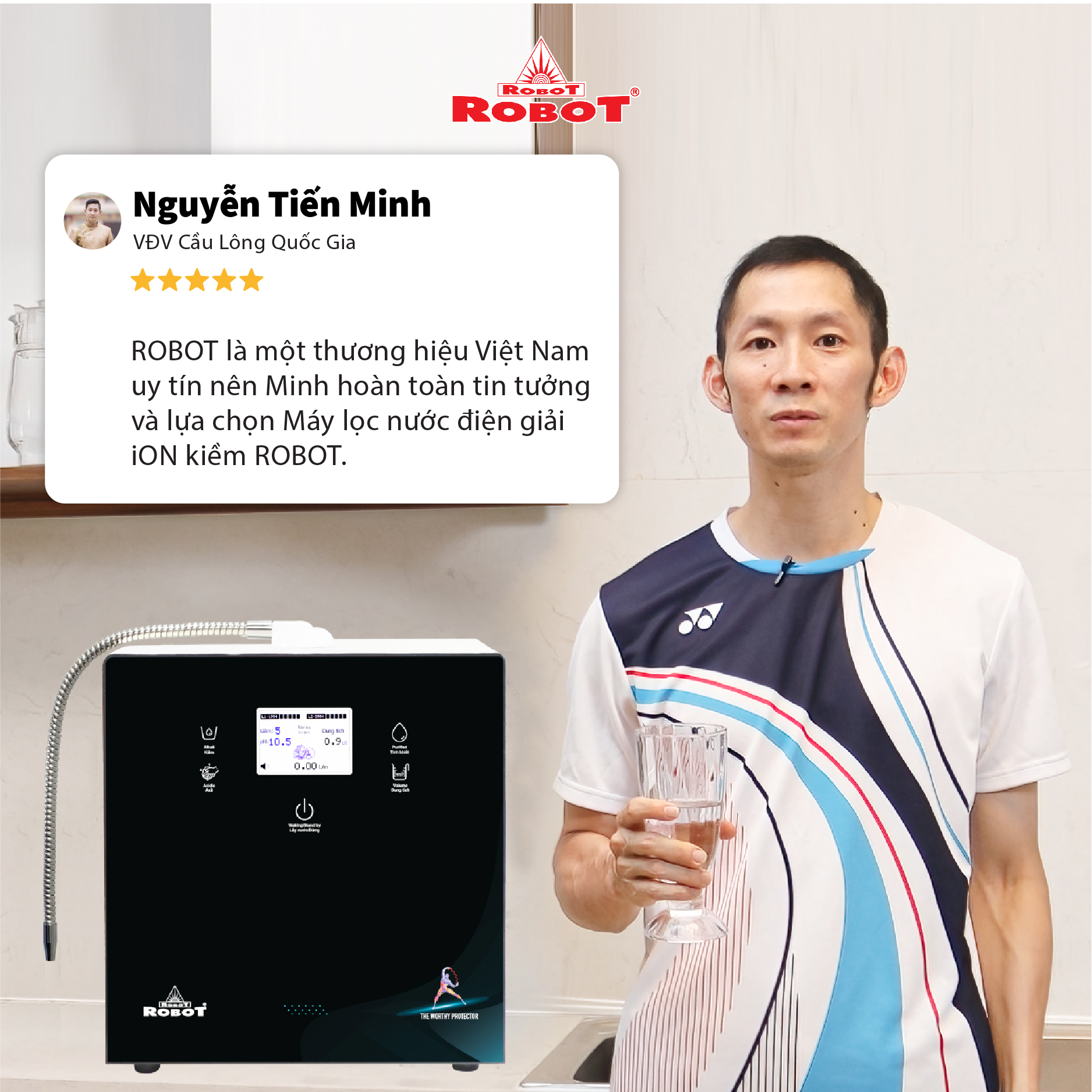 VĐV Cầu Lông Nguyễn Tiến Minh – tay vợt từng đứng Top 5 Thế Giới chia sẻ: Sau một thời gian sử dụng Máy lọc nước điện giải iON kiềm Minh thấy cải thiện sức khỏe rất nhiều và tốc độ hồi phục sau tập luyện, thi đấu cũng nhanh hơn so với trước đây. Bây giờ mỗi khi đi tập, hay khi đi thi đấu, Minh đều mang theo nước iON kiềm để uống. ROBOT là một thương hiệu Việt Nam uy tín nên Minh hoàn toàn tin tưởng và lựa chọn Máy lọc nước điện giải iON kiềm ROBOT.