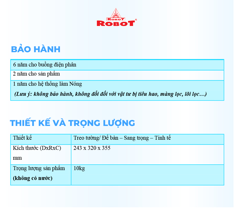 Tổng quan - Kiểu lắp đặt:Tủ đứng - Loại máy:Máy lọc nước RO nóng nguội lạnh - Công nghệ lọc:Thẩm thấu ngược RO - Kháng khuẩn:Nano Silver - Dung tích bình chứa:Tổng 7.8 lít (Nước nóng 0.8 lít, nước lạnh 1 lít, nước thường 6 lít) - Tỷ lệ lọc - thải:Lọc 4.8 - Thải 5.2 (Tỷ lệ này phụ thuộc vào chất lượng nước đầu vào) - Công suất lọc:18 lít/giờ - Công suất tiêu thụ điện trung bình khoảng:0.628 kW/h - Nhiệt độ nước hãng công bố:Nóng 80 - 90°C, Lạnh 10°C - Nhiệt độ nước thực tế:Nóng 80 - 90°C, Lạnh 10°C - Áp lực nước yêu cầu:0.07 - 0.25 MPa - Nơi sản xuất máy bơm:Trung Quốc - Năm ra mắt:2023 - Thương hiệu:Việt Nam - Nơi sản xuất:Việt Nam Thông tin lõi lọc - Số lõi lọc:10 lõi -