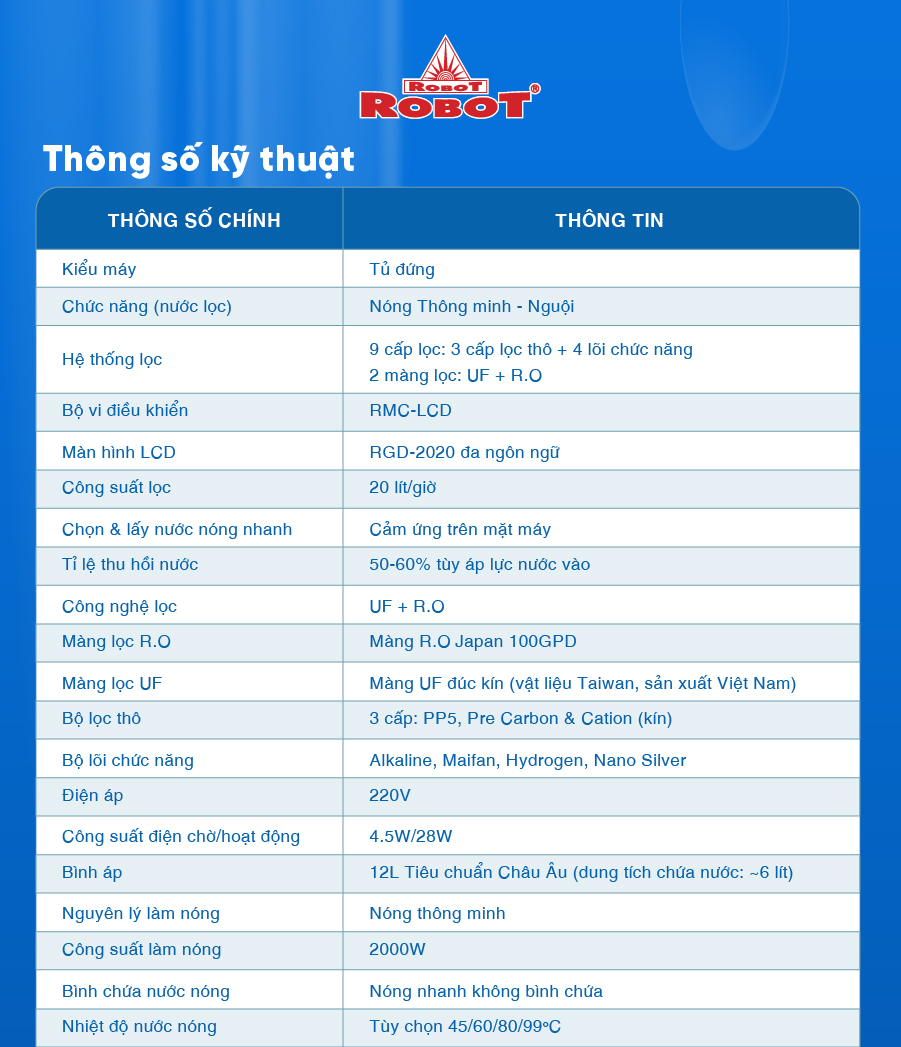 Tổng quan - Kiểu lắp đặt:Tủ đứng - Loại máy:Máy lọc nước RO nóng nguội lạnh - Công nghệ lọc:Thẩm thấu ngược RO - Kháng khuẩn:Nano Silver - Dung tích bình chứa:Tổng 7.8 lít (Nước nóng 0.8 lít, nước lạnh 1 lít, nước thường 6 lít) - Tỷ lệ lọc - thải:Lọc 4.8 - Thải 5.2 (Tỷ lệ này phụ thuộc vào chất lượng nước đầu vào) - Công suất lọc:18 lít/giờ - Công suất tiêu thụ điện trung bình khoảng:0.628 kW/h - Nhiệt độ nước hãng công bố:Nóng 80 - 90°C, Lạnh 10°C - Nhiệt độ nước thực tế:Nóng 80 - 90°C, Lạnh 10°C - Áp lực nước yêu cầu:0.07 - 0.25 MPa - Nơi sản xuất máy bơm:Trung Quốc - Năm ra mắt:2023 - Thương hiệu:Việt Nam - Nơi sản xuất:Việt Nam Thông tin lõi lọc - Số lõi lọc:10 lõi -