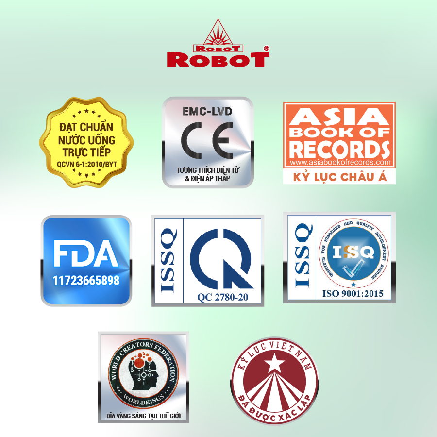 Vượt qua được những đánh giá kiểm định khắt khe về chất lượng, công nghệ & đáp ứng đầy đủ bộ tiêu chí gắt gao, các dòng Máy lọc nước ROBOT thế hệ mới đã đạt được những chứng nhận quốc gia & quốc tế danh giá, như: Tiêu chuẩn quốc gia của Bộ Khoa Học & Công Nghệ, tiêu chuẩn CE Châu Âu, ISO, chứng nhận FDA, Đĩa Vàng Sáng Tạo Thế Giới, chất lượng nước lọc đạt chuẩn nước uống của Bộ Y Tế,… liên tục xác lập Kỷ Lục Việt Nam & Kỷ Lục Châu Á.