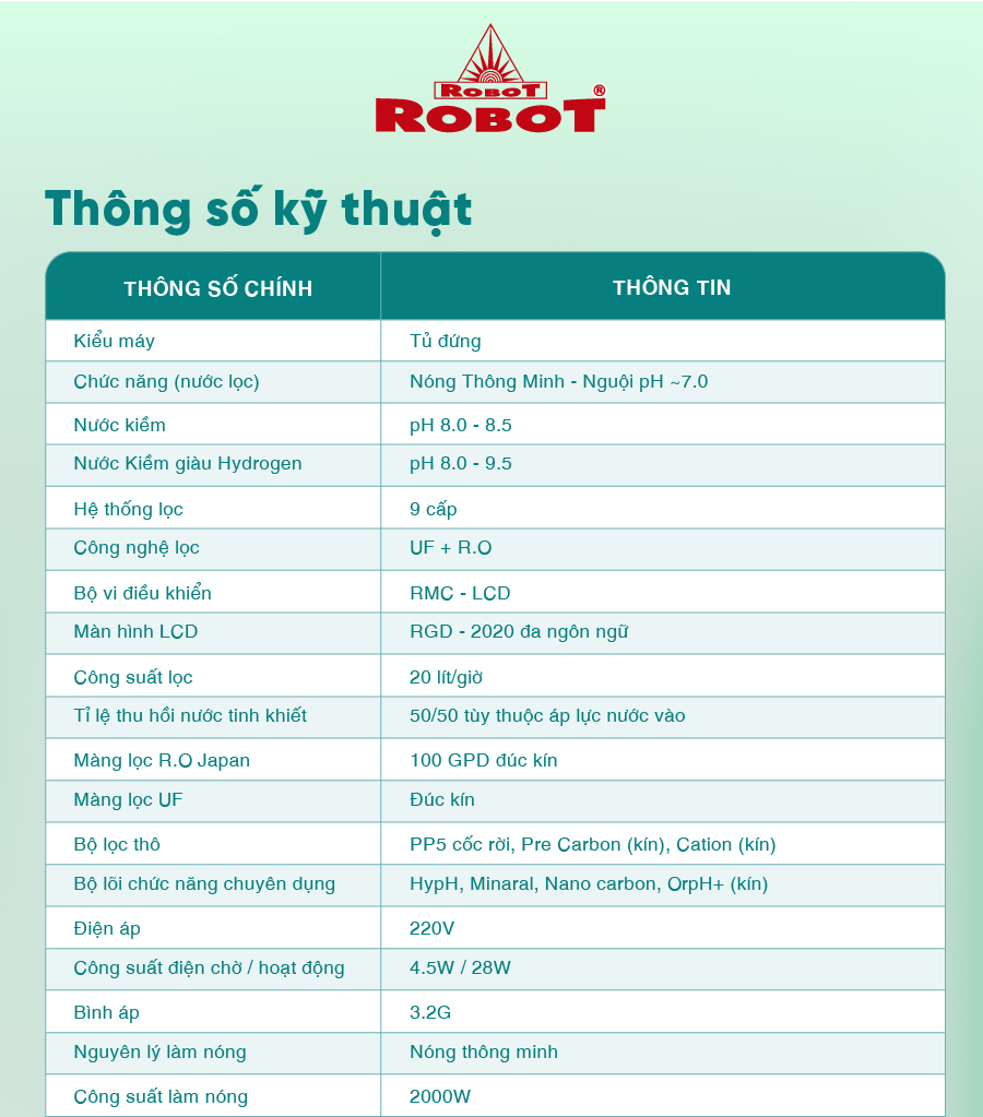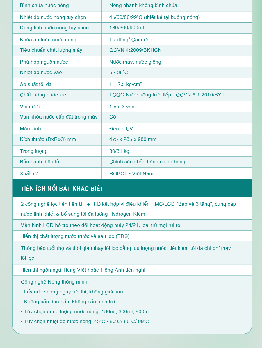 Tổng quan - Kiểu lắp đặt:Tủ đứng - Loại máy:Máy lọc nước RO nóng nguội lạnh - Công nghệ lọc:Thẩm thấu ngược RO - Kháng khuẩn:Nano Silver - Dung tích bình chứa:Tổng 7.8 lít (Nước nóng 0.8 lít, nước lạnh 1 lít, nước thường 6 lít) - Tỷ lệ lọc - thải:Lọc 4.8 - Thải 5.2 (Tỷ lệ này phụ thuộc vào chất lượng nước đầu vào) - Công suất lọc:18 lít/giờ - Công suất tiêu thụ điện trung bình khoảng:0.628 kW/h - Nhiệt độ nước hãng công bố:Nóng 80 - 90°C, Lạnh 10°C - Nhiệt độ nước thực tế:Nóng 80 - 90°C, Lạnh 10°C - Áp lực nước yêu cầu:0.07 - 0.25 MPa - Nơi sản xuất máy bơm:Trung Quốc - Năm ra mắt:2023 - Thương hiệu:Việt Nam - Nơi sản xuất:Việt Nam Thông tin lõi lọc - Số lõi lọc:10 lõi -