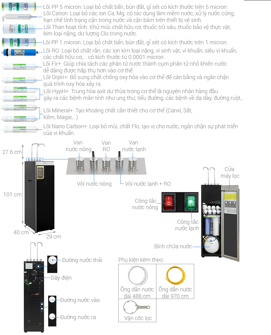 • Lõi chức năng:Lõi 9: HypH+ (Sx Việt Nam)Lõi 8: HypH+ (Sx Việt Nam)Lõi 7: OrpH+ (Sx Việt Nam)Lõi 6: FIR+ (Sx Việt Nam)Lõi 10: Mineral+ (Sx Việt Nam)Lõi 11: Mineral+ (Sx Việt Nam)Lõi 12: Nano Carbon+ (Sx Việt Nam) Hệ thống hoạt động