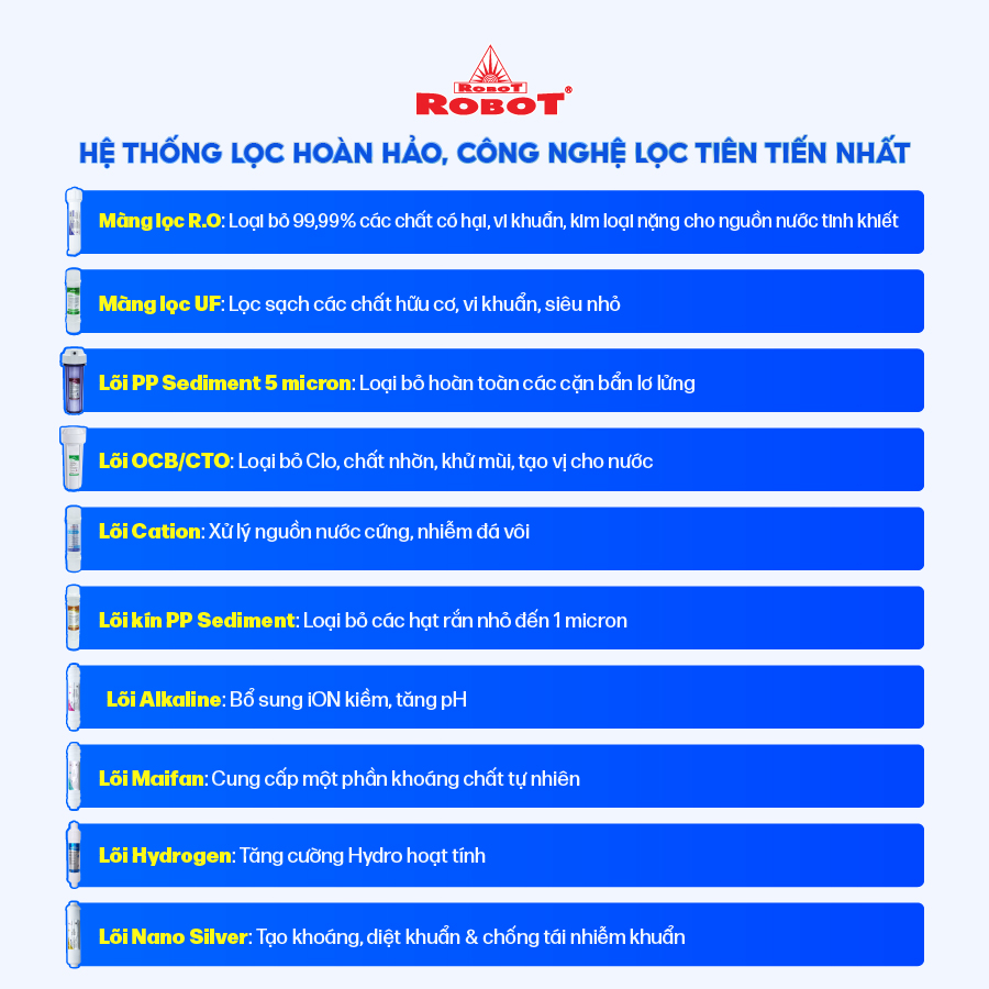 • Máy được tích hợp 2 công nghệ lọc tối ưu nhất hiện nay là UF (Ultrafiltration) & R.O (Reverse Osmosis) cho nguồn nước sau lọc sạch tối đa, được loại bỏ hoàn toàn cặn bẩn hay chất gây hại. Với công nghệ “Bảo vệ 3 tầng”, máy lọc nước ROBOT được các chuyên gia đánh giá là  sản phẩm bảo vệ tuyệt đối an toàn cho sức khỏe   Hệ thống đa cấp lọc mạnh mẽ của ROBOT SPRING PRO 410GH-UR