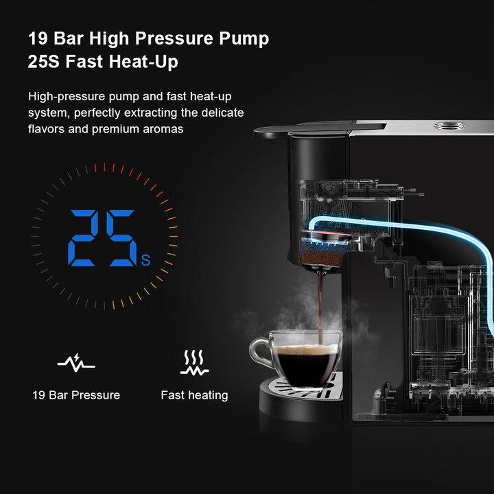 - Tương thích với Capsule of Nespresso, Dolce Gusto hoặc cà phê xay. Tạo ra đồ uống cà phê theo phong cách barista mọi lúc, nhờ vào hệ thống chiết xuất và vận hành một chạm của chúng tôi, mang đến áp suất lên đến 19 bar.