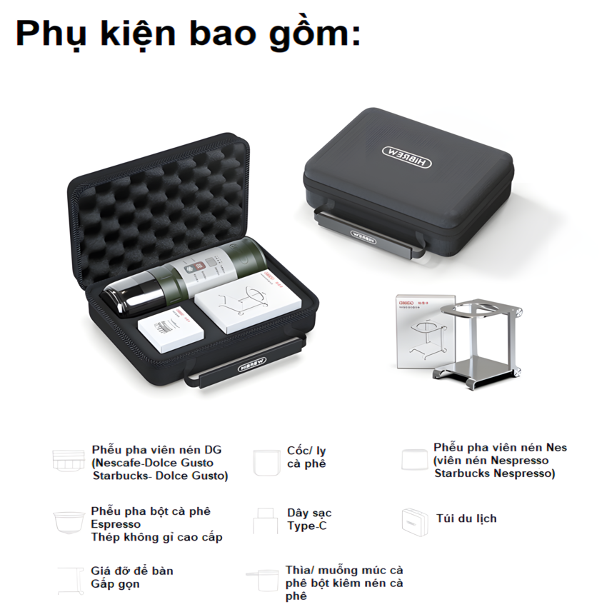- Bộ sản phẩm bao gồm: Thân máy, phễu pha viên nén DG, phễu pha viên nén NES, phễu pha bột cafe Espresso, dây nguồn cấp Type-C, muỗng múc cafe kiêm nén bột, giá đỡ để bàn, túi du lịch.