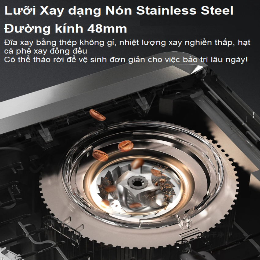 - Bánh răng hình nón nâng cấp 48mm, giúp xay mịn và không bị khét
