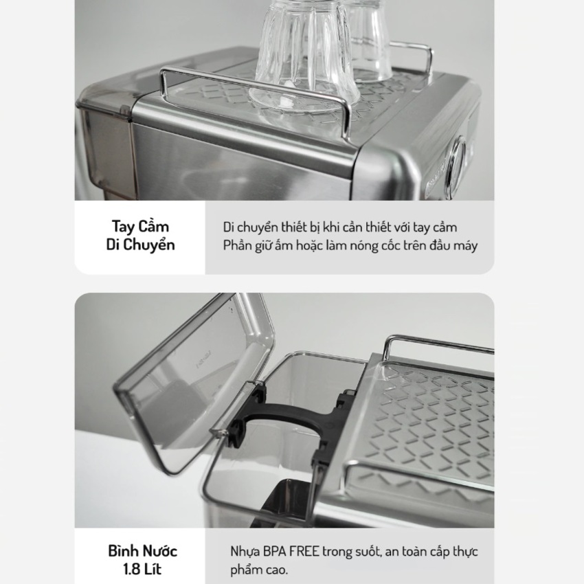 - Tích hợp đồng hồ áp suất kiểm soát shot cafe espresso