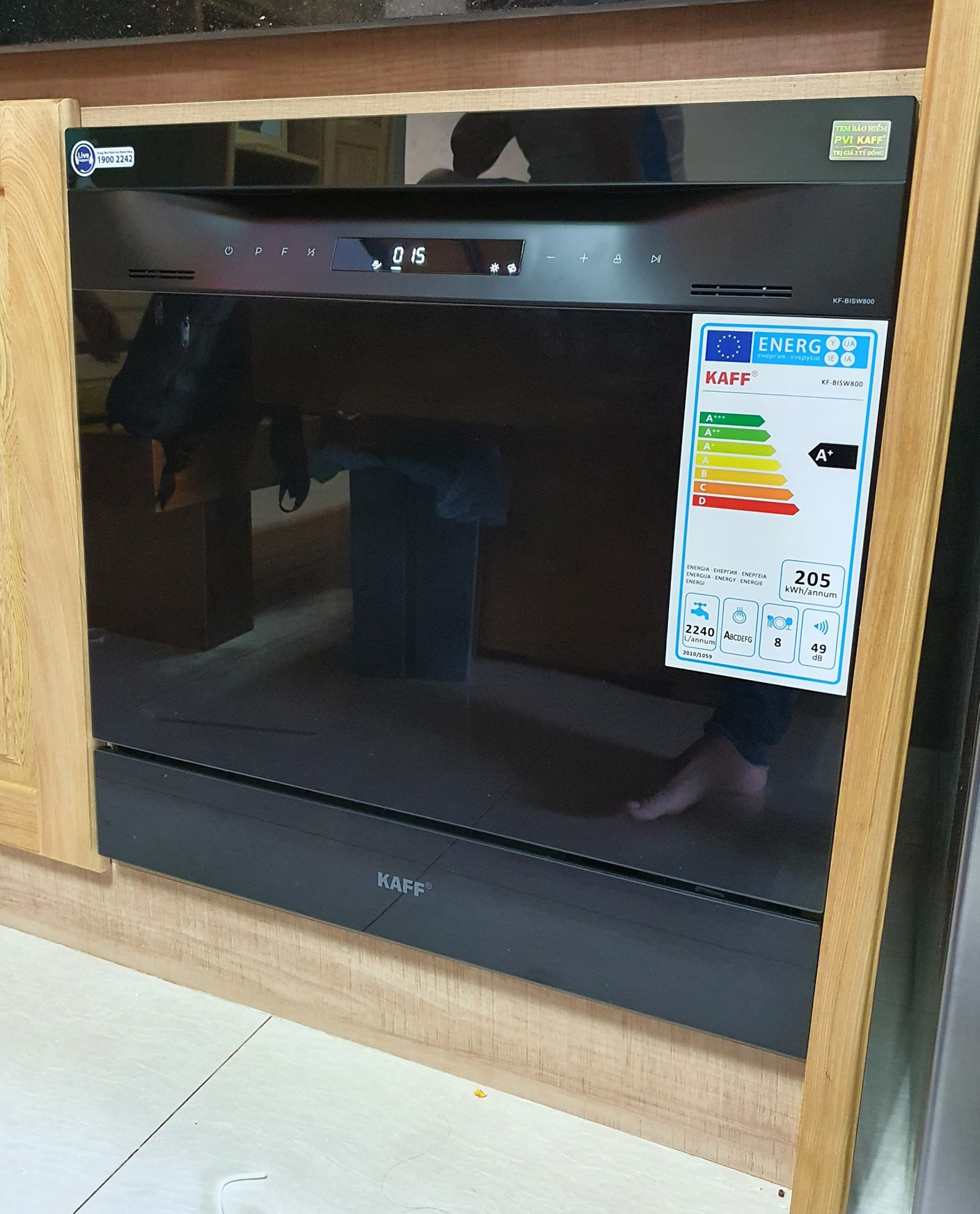MÁY RỬA BÁT KAFF KF-BISW800 | LẮP ÂM TỦ HOẶC ĐỘC LẬP | 8 BỘ | MÀU ĐEN | NHẬP KHẨU NGUYÊN CHIẾC TỪ CHLB ĐỨC | THIẾT KẾ SANG TRỌNG | HỆ ĐIỀU KHIỂN CẢM ỨNG LINH HOẠT | AN TOÀN, BỀN BỈ VÀ TIẾT KIỆM ĐIỆN NĂNG   MÁY RỬA CHÉN ÂM TỦ KAFF KF-BISW800   Từ khi ra mắt trên thị trường máy này đã nhanh chóng nhận được rất nhiều phản hồi tích cực. Liệu rằng đằng sau vẻ đẹp sang trọng vốn có đó, máy rửa bát Kaff KF-BISW800 có điểm gì ưu việt đáng để lựa chọn và tin dùng?   Hiện tại có rất nhiều thương hiệu máy rửa bát trên thị trường trong đó máy rửa bát Kaff KF-BISW800 được người dùng yêu thích và tin dùng nhiều nhất. Đây là loại máy rửa bát mini cho phép người dùng rửa tối đa 8 bộ bát đĩa Châu Âu. Loại máy này do thương hiệu Kaff nhập khẩu và phân phối, sử dụng linh kiện chính hãng, đạt tiêu chuẩn năng lượng Châu Âu: A++, cho chất lượng máy vượt trội.   So với các loại máy rửa bát thông thường khác, loại máy rửa bát Kaff KF-BISW800 có nhiều ưu điểm vượt trội hơn, cho phép rửa được cả xoong nồi chảo. Dòng máy này rất thích hợp cho các gia đình ít người, từ 2-4 thành viên hoặc hộ gia đình có nhu cầu sử dụng ít.   ĐẶC ĐIỂM NỔI BẬT   Tổng quan thiết kế Máy rửa bát Kaff KF-BISW800 có thiết kế hình chữ nhật dọc, có kích cỡ R595 x S480 x C595 mm. Nhìn bề ngoài, máy có hình dạng như một chiếc tủ lạnh mini, khá nhỏ gọn và tiện ích, dễ dàng di chuyển tới nhiều vị trí khác nhau trong căn bếp gia đình.   Máy rửa bát Kaff KF-BISW800 được thiết kế dạng âm tủ. Người dùng có thể linh hoạt đặt trên mặt bàn hoặc lắp âm tủ đều được. Tuy nhiên, nếu muốn lắp đặt âm thì cần phải đảm bảo diện tích khoang tủ lớn hơn kích thước của máy, để dễ dàng sử dụng và vệ sinh.   Máy rửa bát 8 bộ Kaff KF-BISW800 có nhiều điểm ấn tượng, độc đáo và mới lạ hơn so với nhiều loại máy rửa bát thông thường. Chất liệu của máy là thép không gỉ, bền chắc, toàn thể máy sử dụng tông màu đen bóng sạch, đẹp tạo cảm giác sang trọng, hiện đại.   Mặt trước Mặt trước của máy rửa bát Kaff KF-BISW800 có phần tay vịn, bên trong là khoảng trống hở để người dùng dễ dàng nắm được và kéo ra khi cần. Tay vịn được làm bằng chất liệu inox 304. Chi tiết hoàn thiện tỉ mỉ và được gắn chắc chắn trên mặt cánh của máy.   Phía dưới thanh tay vịn là bảng điều khiển của máy, chứa các phím bấm hiện đại, mỗi phím bấm đều có biểu tượng đi kèm và cụm từ tiếng anh tương ứng. Nếu người dùng chưa quen với việc sử dụng tiếng anh, khi mua máy rửa bát sẽ đi kèm sách hướng dẫn sử dụng để giới thiệu chi tiết các tính năng của máy.   Tên thương hiệu được hiển thị ở chính giữa phía dưới chân máy rửa bát. Dưới cùng là phần đáy của máy rửa bát Kaff KF-BISW800. Phần đáy được ngăn cách với phần thân mới bởi 1 đường khe hở khoảng 1-2cm.   Mặt đáy Máy rửa bát Kaff KF-BISW800 có mặt đáy không bằng phẳng hoàn toàn như nhiều loại máy khác. Mặt đáy của máy có 4 trụ, tiếp xúc trực tiếp với sàn đất, làm bệ đỡ chính cho trọng lượng của máy. 4 trụ ở 4 góc đều được làm từ chất liệu thép không gỉ nên khả năng chịu lực tốt, chịu nhiệt và tính thích ứng với môi trường cao, không lo về vấn đề han gỉ, ẩm mốc.   Mặt đằng sau Mặt đằng sau sẽ toàn bộ khung màu đen, chứa ống thoát nước dài 158cm và ống cấp nước dài 154cm. Ngoài ra còn hệ thống dây điện dài 149cm. Tất cả những vật dụng liên quan đến dây điện, ống dẫn nước được sắp xếp ở mặt sau để tiết kiệm diện tích và đảm bảo tính thẩm mỹ cho máy rửa bát Kaff Kaff KF-BISW800.   Thiết kế bên trong Máy rửa bát Kaff KF-BISW800 có 2 khay rửa di động hay còn gọi là 2 giàn rửa bát đĩa. Khay trên là khay tiếp xúc gần sát với phần trán lắp trên của máy. Khay trên chủ yếu rửa các loại bát đĩa nhỏ, cốc, ly, vật dụng nhỏ không tốn diện tích.   Khay dưới của máy có khoang chứa rộng hơn, cho phép rửa các loại nồi nấu, chảo, bát đĩa ác loại đĩa thìa, người dùng có thể cho vào vào giỏ màu xám ở trong khay rửa dưới hoặc xếp làm ngang, sao cho các không có bất cứ vật dụng nào cản trở vào 2 tay quay gạt nước của máy.   Ở phía trong bên của máy rửa bát Kaff KF-BISW800 có chứa ngăn chứa muối và ngăn chứa các chất rác trong quá trình rửa. Người dùng cần dùng loại muối chuyên dụng cho máy rửa bát. Mỗi lần đổ muối sẽ dùng được khoảng 1,5 tháng - 2 tháng. Khi hết lượng muối cần thiết, máy sẽ báo hiệu ở trên bảng điều khiển.   Bên cạnh đó, phần cánh cửa đậy cần biết về ngăn đựng chất làm bóng và ngăn đựng viên tẩy rửa. Chất làm bóng giúp cho bát đĩa được sáng và bóng hơn, trong khi đó viên tẩy rửa là chất liệu quan trọng để đánh sạch mọi vết bẩn.   CÁC TÍNH NĂNG VÀ CHƯƠNG TRÌNH RỬA CỦA MÁY   Máy rửa bát Kaff KF-BISW800 có công suất tiêu