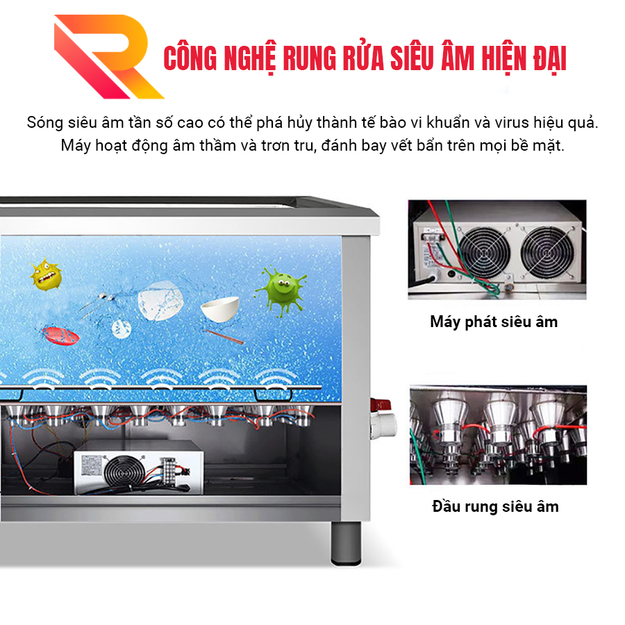 - Dung tích bồn rửa : 144L Ưu điểm của máy rửa chén sóng siêu âm Rama RB1000 Với nguyên lý hoạt động làm sạch bằng sóng siêu âm, máy rửa chén bằng sóng siêu âm Rama RB1000 mang đến những ưu điểm sau:
