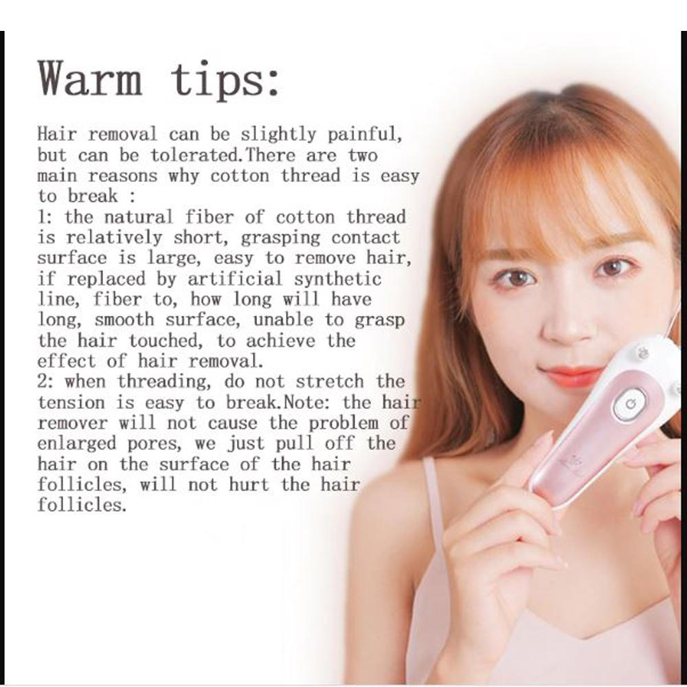 Máy se triệt lông măt - Công cụ tẩy lông mặt hiện đại dòng cao cấp sạc pin - SG665 Thiết bị tiết kiệm điện này sử dụng nguồn pin lithium có thể sạc lại USB cho tuổi thọ pin dài Chiếc máy nhổ lông bằng chỉ (hay còn gọi là máy se lông bằng chỉ) được phát minh theo phương thức truyền thống của người Trung Âu cổ xưa. Khi di chuyển sợi chỉ trên bề mặt da một cách nhanh chóng, các sợi lông sẽ được loại bỏ. Cách tẩy lông này không những an toàn cho làn da của bạn mà còn đem đến hiệu quả bất ngờ trong việc loại bỏ đám lông khó ưa giúp sợi lông mọc ra ít và tơ hơn Lưu ý: Khi sử dụng máy nhổ lông không để máy ở gần tóc, lông mi  Tránh nước vào máy. Sau khi sử dụng cảm giác thường thấy là hơi đau rát và mẩn đỏ da trong những lần đầu thử phương pháp này. Lúc này, da đang bị tổn thương do đó bạn không nên rửa mặt bằng dung dịch có chất tẩy rửa mạnh. Thay vào đó bạn nên chăm sóc da bằng cách thực hiện những việc sau:Chuẩn bị một túi đá lạnh và đắp lên vùng da triệt lông để làm dịu các vết sưng tấy. Thoa kem dưỡng ẩm để dịu vùng da vừa triệt lông.