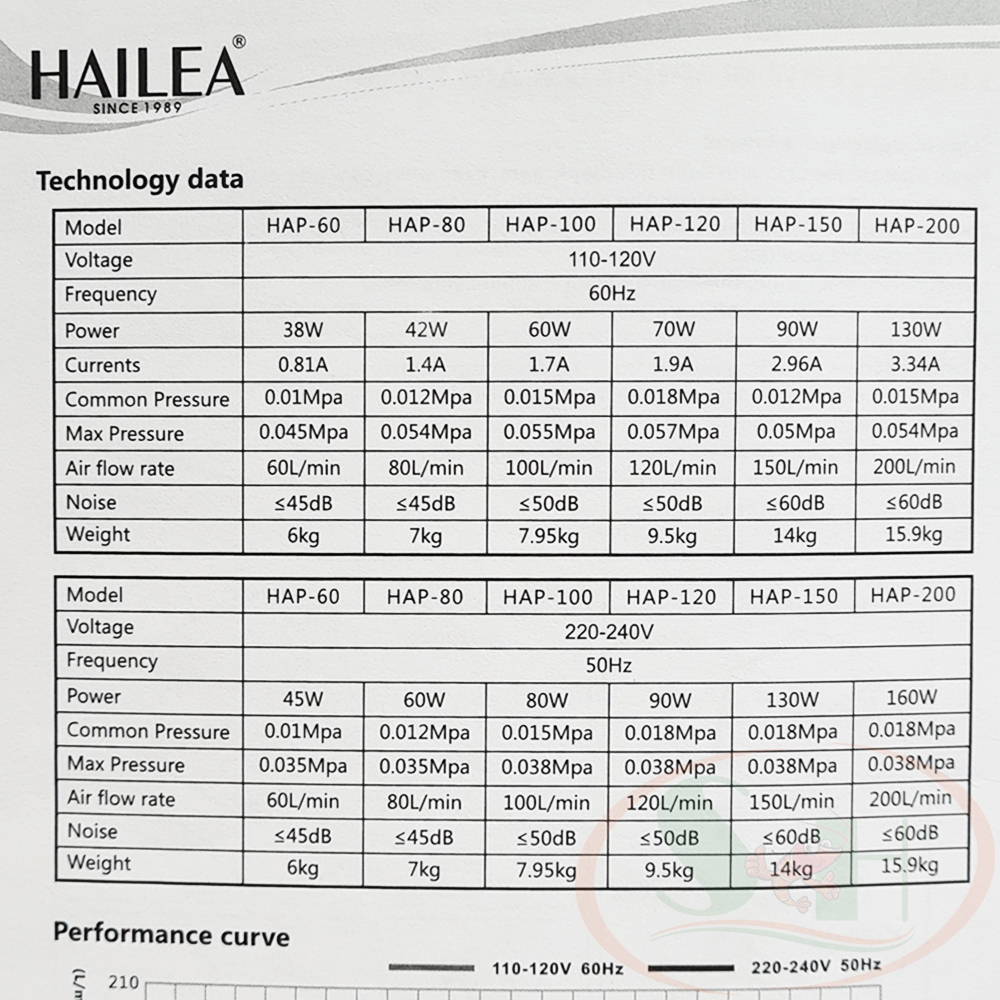 Hailea HAP series sử dụng vỏ hợp kim nhôm định hình cao cấp, hệ thống giảm chấn kép và chức năng hấp thụ rung, độ ồn rất thấp nên hoạt động yên tĩnh. Buồng khí kép tạo ra lượng khí có áp suất đẩy mạnh.