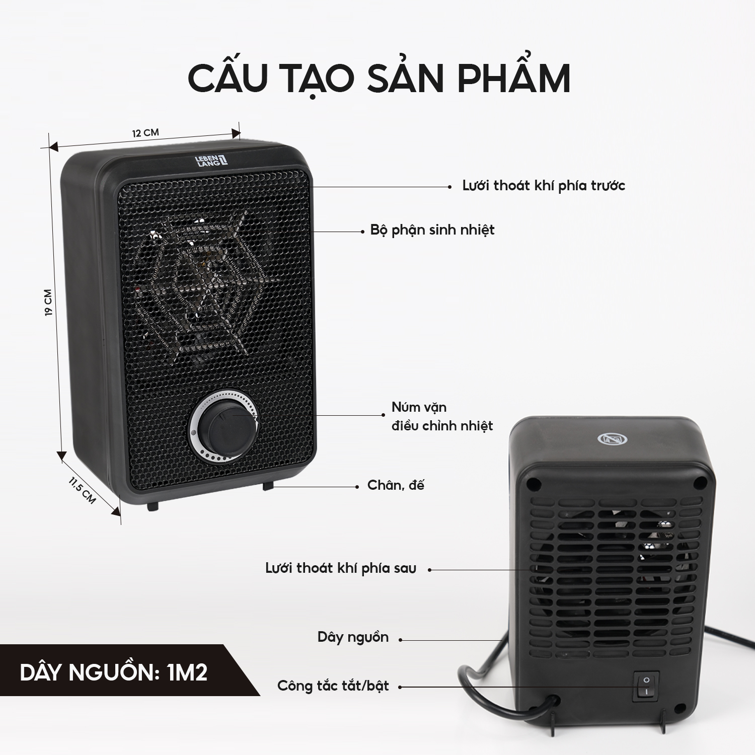 Máy sưởi mini dáng tròn Lebenlang LBL0275, công suất 1500W, làm ấm góc rộng, nóng nhanh, nhỏ gọn tiện lợi - hàng chính hãng 8 LÝ DO BẠN NÊN CHỌN MÁY SƯỞI CỦA LEBENLANG - Công suất mạnh mẽ 1500W - Làm ấm góc rộng - Nóng nhanh tiết kiệm thời gian, năng lượng - Không gây khó thở và khô da - Nhỏ gọn và tiện lợi, thiết kế bắt mắt - Độ bền cao - Hàng chính hãng, bảo hành 2 năm I. THÔNG SỐ KỸ THUẬT - Thương hiệu: Lebenlang - Model: LBL0275 - Màu sắc: Đenn - Công suất: 1500W - Cân nặng: 1,36kg - Dây nguồn: 1m4 - Kích thước: 23 x 18 x 23 cm - Chất liệu: nhựa ABS cao cấp II. ĐẶC ĐIỂM NỔI BẬT Cảm giác ấm áp và tiện lợi không còn xa xôi với Máy Sưởi Mini Lebenlang LBL0275. Thiết kế nhỏ gọn dáng tròn với kích thước chỉ 23x18x23cm, sản phẩm này dễ dàng đặt trên bàn làm việc, bàn học, phòng ngủ hoặc bất kỳ không gian nào dưới 15m². ️ Với công suất tối đa 1500W, máy sưởi này có thể nhanh chóng làm ấm không gian xung quanh bạn. Máy sưởi Lebenlang hoạt động cực kỳ hiệu quả, tỏa nhiệt góc rộng lên đến 70 độ, đảm bảo không gian ấm áp đều đặn. ️ Máy sưởi Lebenlang LBL0275 có 2 nút điều chỉnh cơ học với 3 chức năng chính. Bạn có thể điều chỉnh nhiệt độ từ MIN đến MAX theo mong muốn và chọn chế độ hoạt động phù hợp: chế độ quạt gió, chế độ 1 hoặc chế độ 2. Đặc biệt, máy sưởi LBL0275 có chế độ tiết kiệm năng lượng với công suất 750W, giúp bạn tiết kiệm đến 50% năng lượng điện. ️ Quạt sưởi mini với tiếng ồn thấp, máy không gây ảnh hưởng đến giấc ngủ hoặc các hoạt động khác.