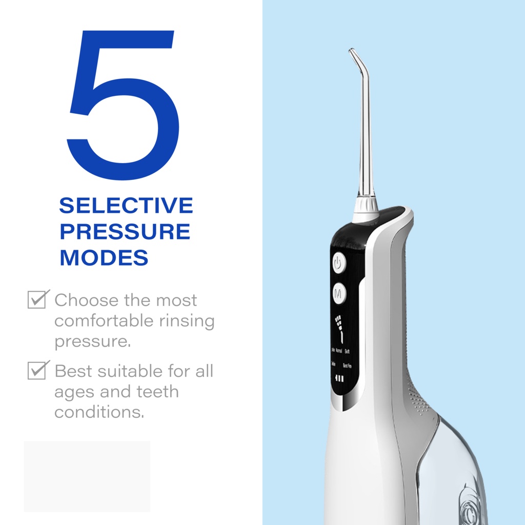 - Điều chỉnh chế độ áp suất (Bạn có thể điều chỉnh chế độ áp suất trên máy tăm nước bằng cách nhấn nút chế độ trên tay cầm. Bắt đầu với cài đặt thấp nhất và tăng dần theo ý thích của bạn)