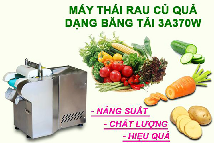 Hiện nay tại các cơ sở chế biến thực phẩm, bếp nhà hàng, quán ăn, khách sạn ẩm thực nhu cầu thái lát rau củ quả với khối lượng lớn là rất phổ biến. Nhằm giúp công đoạn này trở nên chuyên nghiệp và nhanh chóng hơn, chúng tôi đã phân phối ra thị trường sản phẩm Máy thái lát rau củ quả dạng băng tải 3A370W. Ưu điểm nổi bật của máy thái lát rau củ quả dạng băng tải 3A370W Máy thái lát rau củ quả 3A370W (có băng tải) được làm từ chất liệu inox cao cấp, chắc chắn, không bị gỉ sét trong quá trình làm việc, đảm bảo vệ sinh an toàn thực phẩm, nâng cao tuổi thọ sử dụng máy. Kích thước máy nhỏ gọn, chỉ 520 x 290 x 440 mm, trọng lượng 27kg dễ dàng di chuyển, đặt để ở mọi vị trí trong không gian bếp nấu, không chiếm quá nhiều diện tích. Máy thái lát rau củ quả dạng băng tải 3A370W có thể thái đa dạng các loại rau củ quả như khoai tây, khoai lang, cà rốt, dưa chuột (dưa leo), củ cải, các loại rau xanh, cắt hành lá  Với lưỡi dao sắc bén, máy thái lát dứt khoát, nhanh chóng. Thành phẩn thu được đồng đều, đẹp mắt, lát cắt phẳng đẹp, không bị dập nát. Đặc biệt bạn có thể điều chỉnh tốc độ băng tải để điều chỉnh kích thước đầu ra từ 2 - 10mm. Năng suất của máy thái lát 3A370W rất ấn tượng, đạt 60 - 100kg/giờ (tùy kích thước thái), cao gấp nhiều lần thái thủ công. Sử dụng sản phẩm, bạn sẽ tiết kiệm được thời gian, công sức và chi phí cho nhân công làm việc. Cấu tạo của Máy thái lát rau củ quả dạng băng tải 3A370W