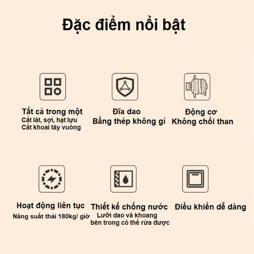 - Năng suất cắt: Khoảng 100kg/ giờ ( tùy nguyên liệu)