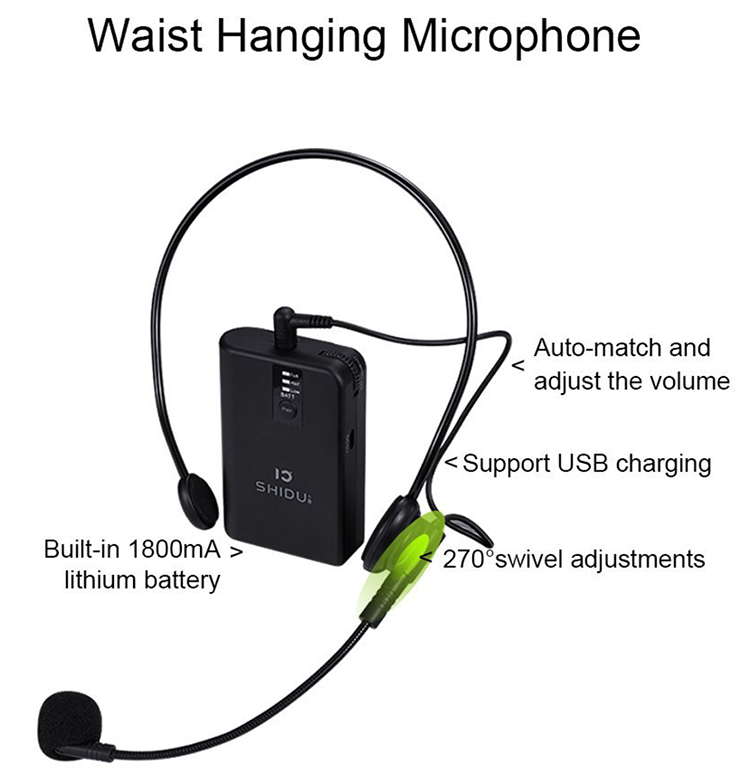 Thiết kế cho việc giảng dạy Máy Trợ Giảng Không Dây Shidu SD-S92 tiếp tục cho ra mắt dòng máy trợ giảng không dây tiên tiến, hứa hẹn là dụng cụ hỗ trợ đắc lực cho các giáo viên trong công việc giảng dạy. Công suất 25W Máy trợ giảng có công suất 25W, dải tần âm thanh nằm ở dải trung từ 90Hz - 18KHz, giúp âm thanh phát ra được to rõ, cho diện tích phủ âm thanh lên tới 200m2. Micro không dây công nghệ sóng UHF Kèm theo micro không dây có thể tháo rời sử dụng như micro cầm tay hoặc micro gài tai. Khả năng nhận sóng tín hiệu từ micro rồi khuếch đại nó lên giúp người nghe trong phạm vi 40m có thể nghe rõ ràng được tích hợp công nghệ khuếch đại UHF, cho tầm khuếch đại sóng âm lên tới 30-40m2 và được trang bị màn hình LED hiển thị kỹ thuật số dùng cho nghe nhạc Mp3. Hỗ trợ 2 Micro không dây Một ưu điểm vượt trội hơn so với các dòng máy trợ giảng khác, đó là hỗ trợ 2 Micro không dây cài đầu và Micro cầm tay có khả năng nói được cùng lúc 2 mic. Rất phù hợp với những người phải nói ở chỗ đông người như giáo viên giảng bài trên lớp, nhân viên bán hàng siêu thị, hội họp, văn phòng, buổi meeting, ngoài trờ Máy được thiết kế chắc chắn, lớp sơn đen bóng mang lại vẻ sang trọng khi sử dụng. Hỗ trợ thẻ nhớ lên tới 32GB Được trang bị cổng USB, khe cắm thẻ nhớ hỗ trợ thẻ nhớ lên tới 32GB, cho phép chạy các bài giảng có sẵn, dùng thay loa nghe nhạc Dung lượng pin 2600mAh Với dung lượng pin lớn lên đến 2600mAh cho phép nói liên tục trong 20 tiếng, bạn không còn phải lo hết pin khi đang sử dụng, đảm bảo công việc hoạt động cho cả ngày của các giáo viên, giảng viên,