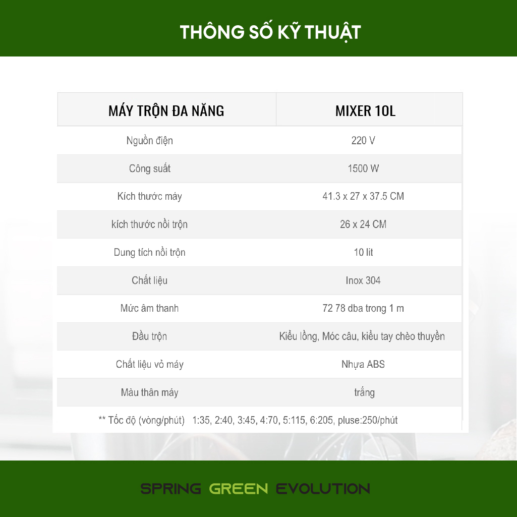 - Giá giữ đầu trộn sử dụng vật liệu chắc chắn. THÔNG SỐ KỸ THUẬT Máy trộn đa năng MIXER 10L Nguồn điện 220 V Công suất 1400 W Kích thước máy 41.3 x 27 x 37.5 cm kích thước nồi trộn 26 x 24 CM Dung tích nồi trộn 10 lit Chất liệu Inox 304 Mức âm thanh 72 – 78 dba trong 1 m Đầu trộn Kiểu lồng, Móc câu Chất liệu vỏ máy Nhựa ABS Màu thân máy trắng Tốc độ (vòng/phút) :250/phút HƯỚNG DẪN SỬ DỤNG MẪU SẢN PHẨM SỬ DỤNG VỚI MÁY MIXER 10L MÁY TRỘN ĐA NĂNG CỦA CHÚNG TÔI CÓ NHIỀU MẪU MÃ ĐA DẠNG Công ty SGE sản xuất và phân phối nhiều loại máy trộn thực phẩm theo mục đích và quy mô của kinh doanh. Nếu khách hàng mong muốn một chiếc máy trộn thực phẩm với công suất lớn cho doanh nghiệp ĐIỀU KIỆN BẢO HÀNH Sản phẩm được bảo hành chính hãng 1 năm kể từ ngày mua hàng Bảo hành đổi mới sản phẩm trong vòng 7 ngày Không nhận bảo hành máy và các phụ tùng trên máy khi gặp sự cố do một trong các nguyên nhân sau: