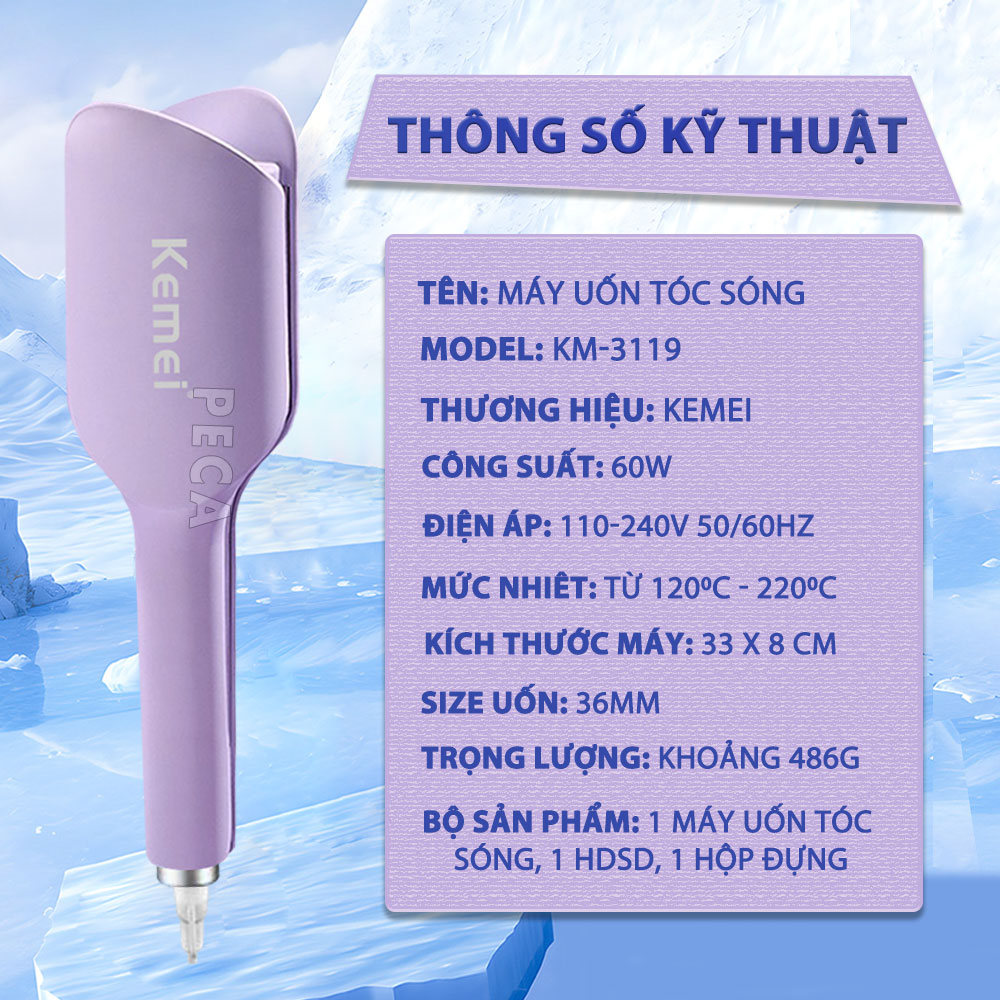 - Chất liệu tấm nhiệt : PTC Kích thước máy 33 x 8 Cm Size uốn 36 mm Phương pháp sạc Cắm điện trực tiếp Bộ sản phẩm gồm 1x máy uốn sóng, 1x HDSD, 1x hộp đựng Nhiệt độ tối thiểu 120℃ Nhiệt độ tối đa 220℃ Mức nhiệt 6 mức nhiệt HƯỚNG DẪN SỬ DỤNG MÁY UỐN TÓC SÓNG KEMEI KM-3119: