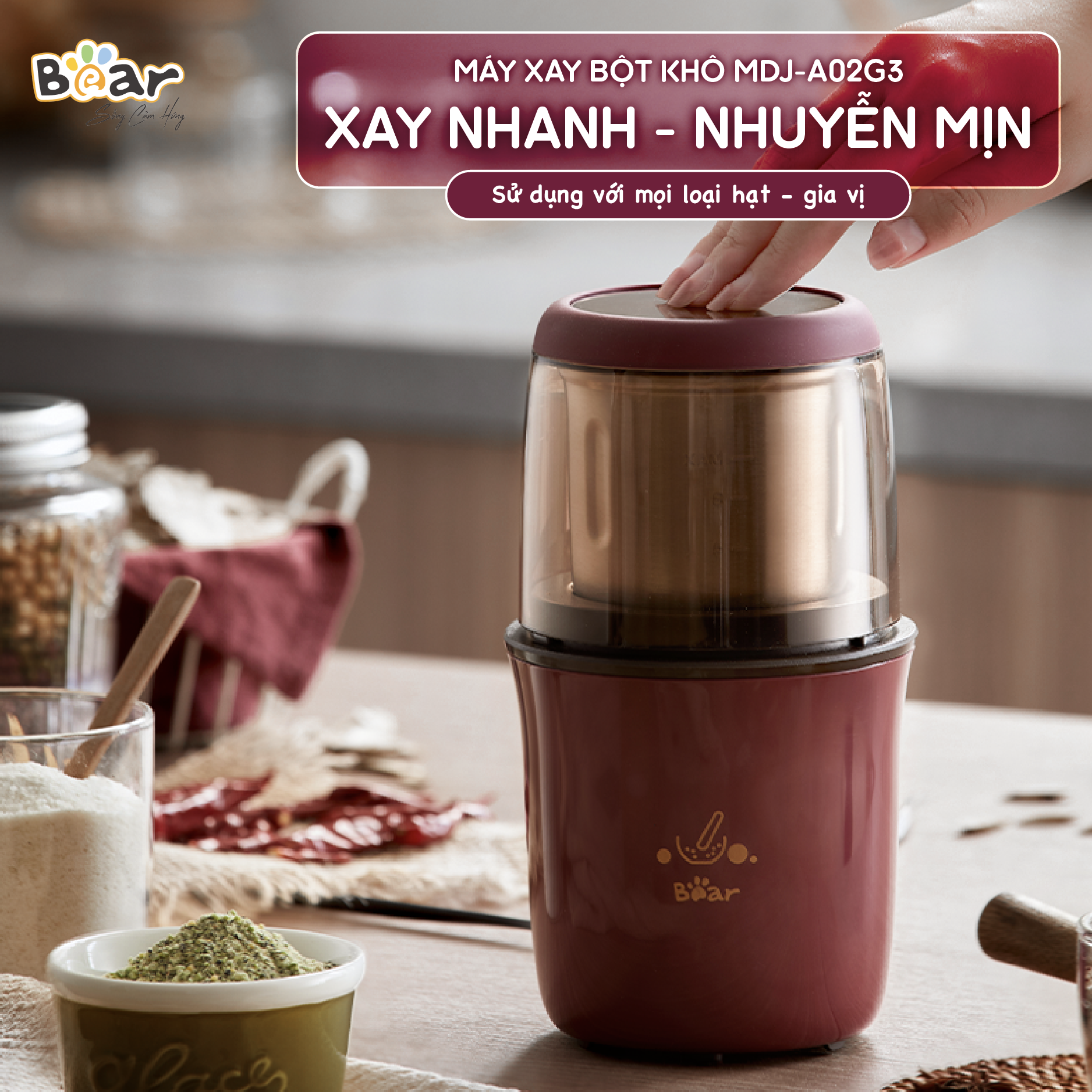 Máy xay bột khô Bear MDJ-A02G3 Thiết kế nhỏ gọn tiết kiệm không gian bếp Công suất: 200 W Chất liệu lưỡi dao: Thép không gỉ 304 Chất liệu cối xay: Nhựa PC Hoạt động
