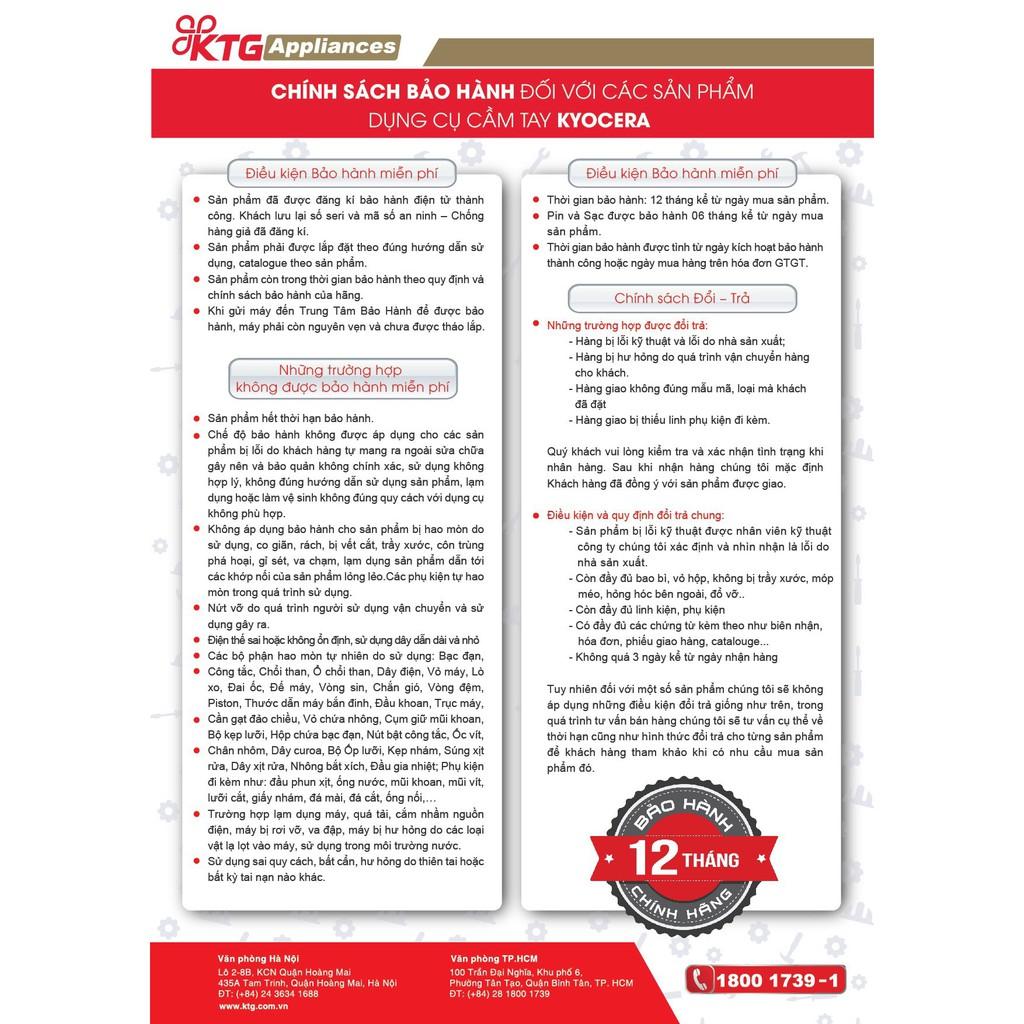 Năm 2018 Kyocera mua lại thương hiệu dụng cụ điện cầm tay Ryobi và triển khai ngành hàng dụng cụ điện cầm tay. Ryobi là một trong những thương hiệu dụng cụ điện cầm tay hàng đầu tại Nhật với thế mạnh đa dạng sản phẩm và chiếm thị phần cao tại thị trường Nhật.