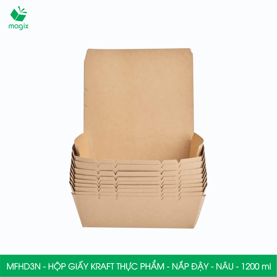 MFHD3N - Hộp giấy Kraft thực phẩm - Nắp đậy - Nâu - 1.200 ml (Miệng: 20x14 cm - Đáy: 18x12 cm - Cao: 5 cm)