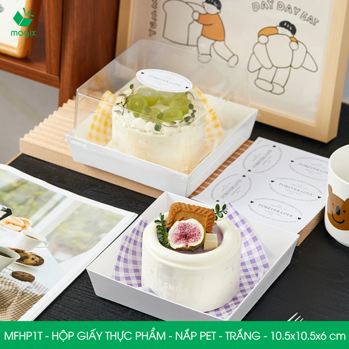 ✨MFHP1T - 10.5x10.5x6 cm - 100 hộp giấy thực phẩm màu trắng nắp Pet, hộp giấy vuông đựng thức ăn, hộp bánh nắp trong