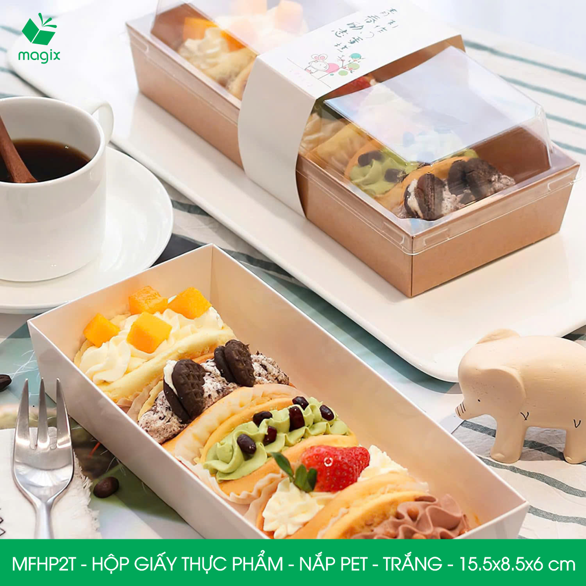 ✨MFHP2T - 15.5x8.5x6 cm - 100 hộp giấy thực phẩm màu trắng nắp Pet, hộp giấy chữ nhật đựng thức ăn, hộp bánh nắp trong