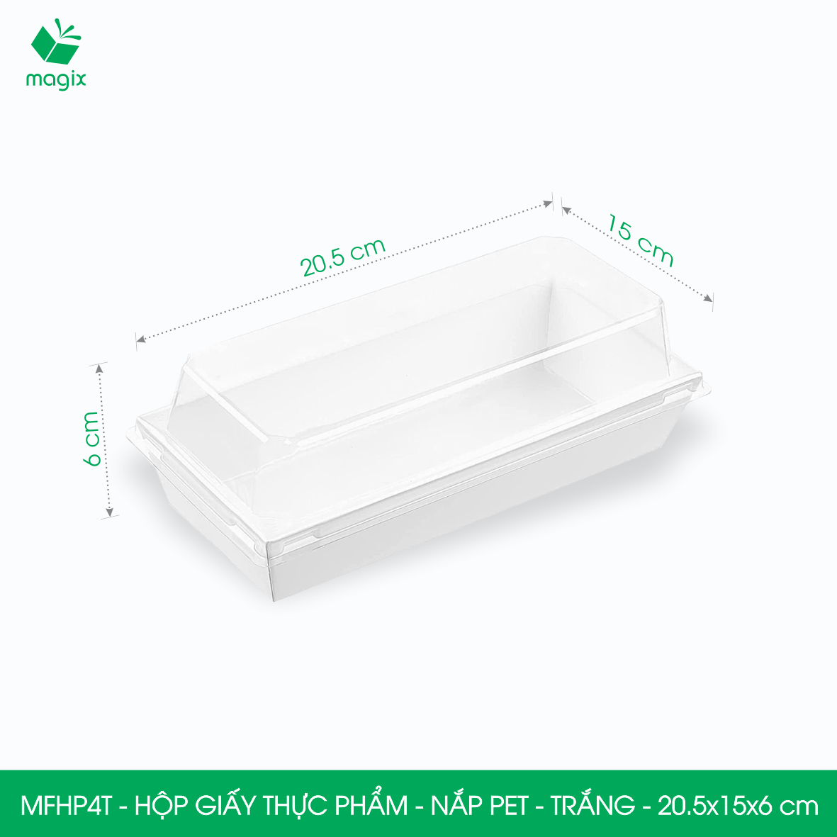 QUY CÁCH KỸ THUẬT Mã sản phẩm - Kích thước: • MFHP1N - Hộp giấy Kraft thực phẩm nắp Pet - Nâu - 10.5x10.5x6 cm • MFHP1T - Hộp giấy thực phẩm nắp Pet - Trắng - 10.5x10.5x6 cm • MFHP2N - Hộp giấy Kraft thực phẩm nắp Pet - Nâu - 15.5x8.5x6 cm • MFHP2T - Hộp giấy thực phẩm nắp Pet - Trắng - 15.5x8.5x6 cm • MFHP3N - Hộp giấy Kraft thực phẩm nắp Pet - Nâu - 20x12.5x6 cm • MFHP3T - Hộp giấy thực phẩm nắp Pet - Trắng - 20x12.5x6 cm • MFHP4N - Hộp giấy Kraft thực phẩm nắp Pet - Nâu - 20.5x15x6 cm • MFHP4T - Hộp giấy thực phẩm nắp Pet - Trắng - 20.5x15x6 cm • MFHP5N - Hộp giấy Kraft thực phẩm nắp Pet - Nâu - 12x12x6.5 cm • MFHP5T - Hộp giấy thực phẩm nắp Pet - Trắng - 12x12x6.5 cm • MFHP6N - Hộp giấy Kraft thực phẩm nắp Pet - Nâu - 14.5x13x6 cm • MFHP6T - Hộp giấy thực phẩm nắp Pet - Trắng - 14.5x13x6 cm • MFHP7N - Hộp giấy Kraft thực phẩm nắp Pet - Nâu - 19.5x9x6 cm • MFHP7T - Hộp giấy thực phẩm nắp Pet - Trắng - 19.5x9x6 cm