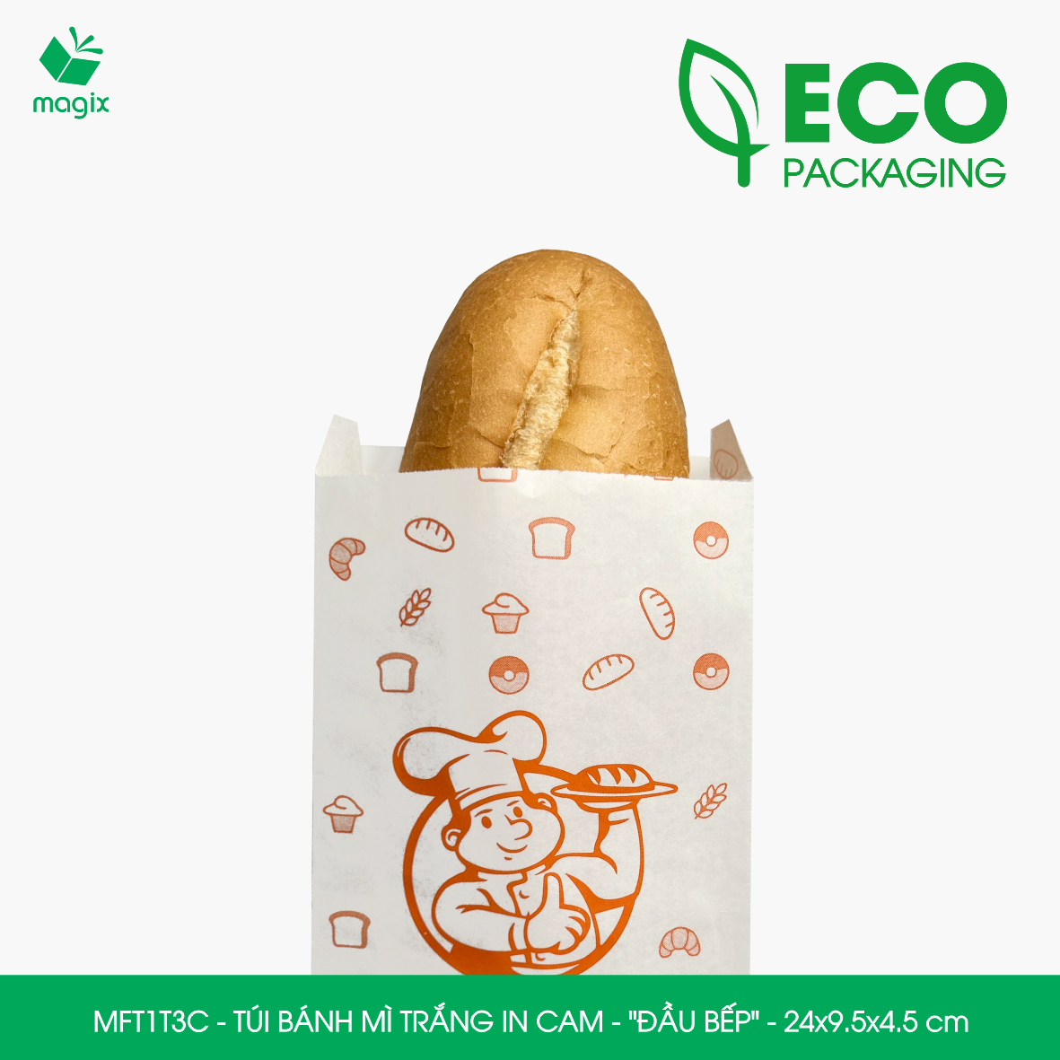 ĐẶC ĐIỂM SẢN PHẨM Chất liệu: Túi bánh mì in thường được làm từ giấy kraft nhật định lượng 50gsm thấm dầu có giấy chứng nhận FDA đảm bảo vệ sinh an toàn thực phầm Thiết kế: Miệng túi thiết kế chia thành 2 lớp dễ dàng thao tác bỏ bánh mì vào túi, đơn giản và tiện dụng    CÔNG DỤNG Tiện lợi: Bảo vệ bánh mì khỏi bụi bẩn, môi trường ô nhiễm, tác động từ bên ngoài và tránh làm dơ tay khi sử dụng Quảng cáo thương hiệu: Túi bánh mì in được sử dụng như một phương tiện quảng cáo nhỏ gọn và hiệu quả, với thiết kế in ấn logo, thông tin về sản phẩm và các thông điệp quảng cáo khác Bảo vệ môi trường: Túi bánh mì được làm từ chất liệu giấy kraft nguyên sinh, giúp giảm thiểu lượng rác thải nhựa và bảo vệ môi trường Tiết kiệm chi phí: Túi giấy bánh mì có giá thành thấp hơn so với các loại bao bì khác như hộp giấy, hộp nhựa đựng bánh mì   TIÊU CHUẨN KỸ THUẬT Chất liệu: Giấy Kraft chuyên dùng cho thực phẩm đạt tiêu chuẩn FDA  Định lượng: 50gsm Mã hàng - Kiểu in - Kích thước  • MFT1N5NN - Túi bánh mì nâu in nâu - "Giỏ bánh mì" - 24x9.5x4.5 cm  • MFT1T5N - Túi bánh mì trắng in nâu - "Giỏ bánh mì" - 24x9.5x4.5 cm  • MFT1N4X - Túi bánh mì nâu in xanh lá - "Best street food" - 24x9.5x4.5 cm  • MFT1T4X - Túi bánh mì trắng in xanh lá - "Best street food" - 24x9.5x4.5 cm  • MFT1N4NN - Túi bánh mì nâu in nâu đỏ - "Best street food" - 24x9.5x4.5 cm  • MFT1T4N - Túi bánh mì trắng in nâu - "Best street food" - 24x9.5x4.5 cm  • MFT1T3C - Túi bánh mì trắng in cam - "Đầu bếp" - 24x9.5x4.5 cm  • MFT1N3NN - Túi bánh mì nâu in nâu đỏ - "Đầu bếp" - 24x9.5x4.5 cm  • MFT1T3NN - Túi bánh mì trắng in nâu đỏ - "Đầu bếp" - 24x9.5x4.5 cm  • MFT1N2NN - Túi bánh mì nâu in nâu đỏ - "Cối xay gió" - 24x9.5x4.5 cm  • MFT1T2N - Túi bánh mì trắng in nâu - "Cối xay gió" - 24x9.5x4.5 cm  • MFT1N1NN - Túi bánh mì nâu in nâu đỏ - "Xe bánh mì" - 24x9.5x4.5 cm  • MFT1T1N - Túi bánh mì trắng in nâu - "Xe bánh mì" - 24x9.5x4.5 cm   LƯU Ý Bảo quản sản phẩm nơi khô ráo, sạch sẽ tránh tiếp xúc trực tiếp với ánh nắng mặt trời và nhiệt độ cao.