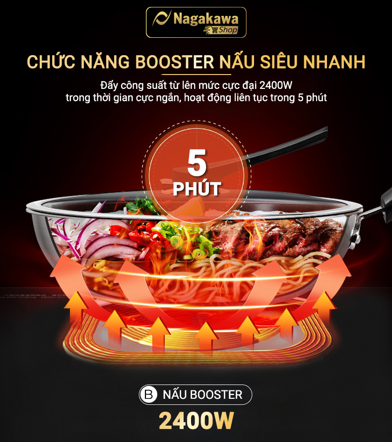 Tính Năng Sản Phẩm Công suất : 1400W+1800W+2200W Chức năng BOSTER thông minh, tự động nâng công suất lên mức tối đa dù đang ở mức công suất nào : 1800W+2000W+2400W Chế độ nấu hiển