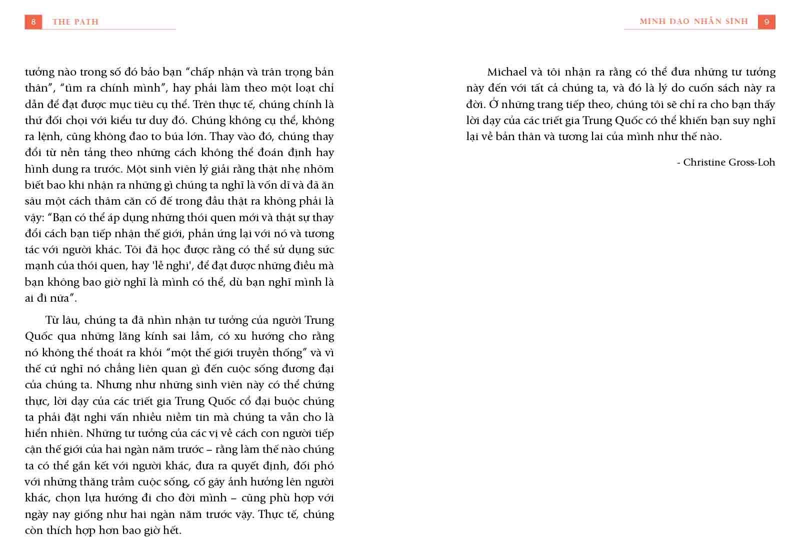 Trong cuốn sách “Minh đạo nhân sinh”, GS. Michael Puett đã hệ thống, giảng giải những triết lý của các triết gia Phương Đông dễ hiểu một cách đáng kinh ngạc. Michael Puett chỉ ra rằng, từ 2.000 năm trước, các triết gia Trung Hoa cổ đại như Khổng Tử, Lão Tử, Mạnh Tử, Trang Tử, Tuân Tử, Quản Tử … đã có những phát kiến tuyệt vời về việc phát triển con người và thay đổi xã hội một cách hài hòa, tích cực.