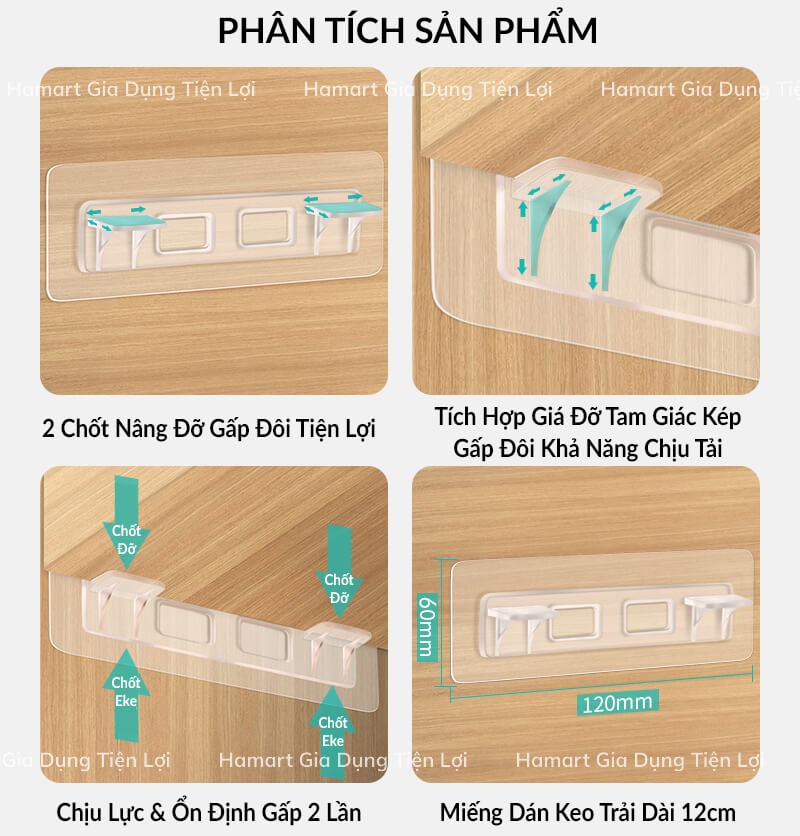 - Móc Đỡ Kệ Đôi chữ L được tăng cường Keo dính trải dài 12cm giúp bám siêu chắc chịu lực tới 20KG