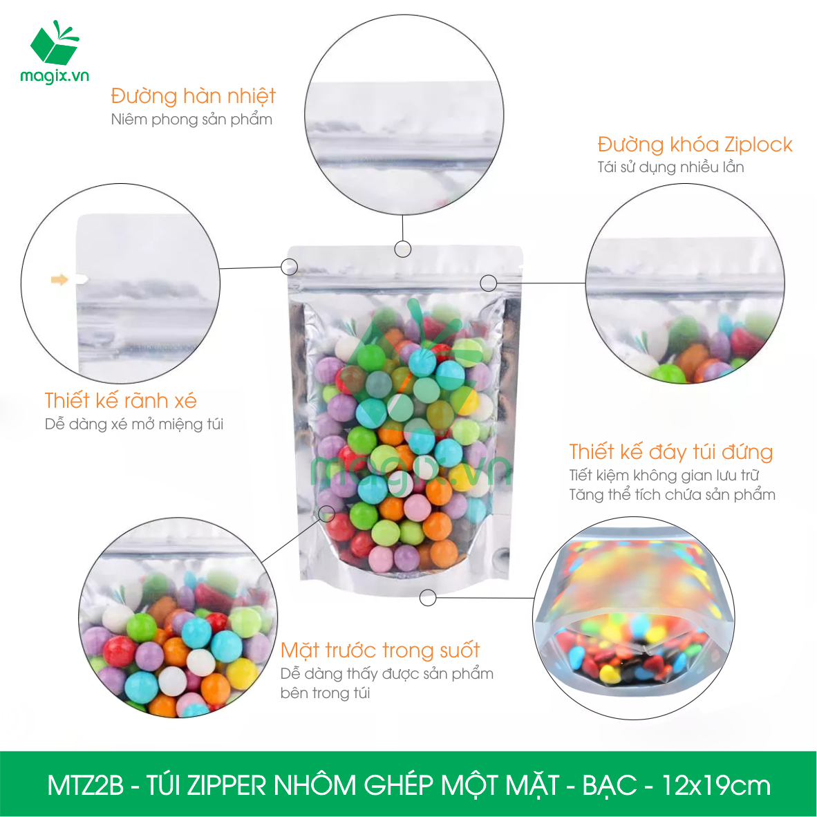 ✨MTZ2B - 12x19cm - Combo 25 Túi Zipper Bạc đáy đứng, một mặt trong