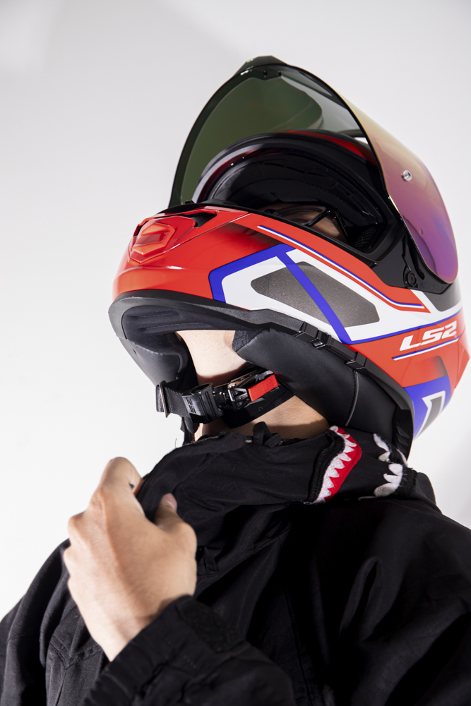 Khóa mũ Mũ Fullface LS2 FF800 STORM sử dụng khóa lẫy làm từ hợp kim thép không gỉ chắn chắn, dễ dàng điều chỉnh độ rộng của dây đeo. Để mở khóa, bạn chỉ cần kéo lẫy màu đỏ rất dễ dàng. Ngoài ra, dây đeo được bao phủ thêm miếng lót cằm giúp người đội thoải mái, có thể tháo rời để giặt.