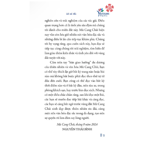 Những nội dung được trình bày trong cuốn sách là kết quả của một quá trình dài tìm hiểu, nghiên cứu và trải nghiệm của các tác giả. Điều quan trọng hơn cả là tình yêu sâu đậm mà chúng tôi dành cho miền đất này. Mù Cang Chải hiện nay vẫn còn lưu giữ nhiều nét văn hóa đặc sắc và những điều bí ẩn cần tiếp tục khám phá. Chúng tôi hy vọng rằng, qua cuốn sách này, bạn đọc sẽ tiếp tục cùng chúng tôi trải nghiệm, tìm hiểu để làm giàu thêm kiến thức và tình yêu đối với vùng đất tuyệt vời này. Cầm trên tay “bản giao hưởng” du dương của thiên nhiên và văn hóa Mù Cang Chải, bạn có thể tùy thích lật giở bất kỳ trang nào hoặc bài nào mà không bắt buộc phải đọc theo thứ tự từ đầu đến cuối. Bạn cũng có thể đọc vào bất kỳ thời điểm nào và ở bất kỳ đâu, trên tàu xe, trong phòng khách sạn, hay trước bàn đọc sách. Nhưng có một điều chắc chắn rằng, sau khi đọc một bài, các bạn sẽ muốn đọc tiếp bài khác và càng đọc, các bạn sẽ càng bất ngờ trước vùng đất Mù Cang Chải xinh đẹp được thiên nhiên ưu đãi, cùng một nền văn hóa đặc sắc trong đa dạng, tạo nên sự quyến rũ làm đắm say lòng người.