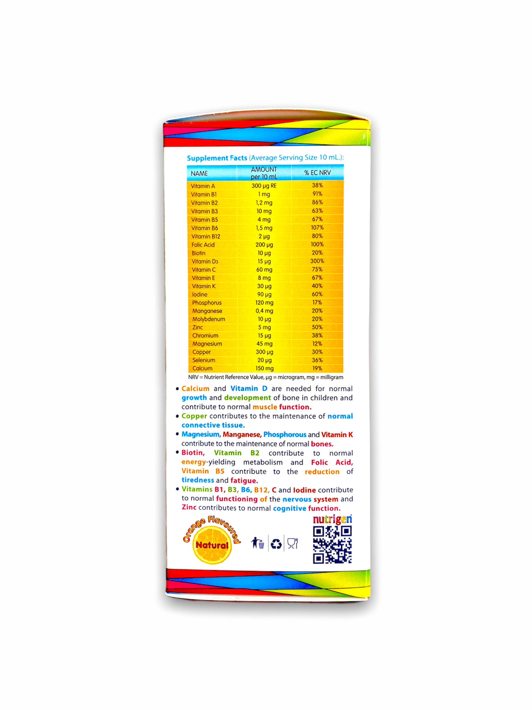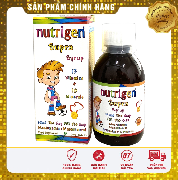 Giới thiệu Bữa ăn trong cuộc sống hiện đại có thể là nguyên do của việc trẻ hấp thu thiếu nhiều loại vitamin và khoáng chất, Nhiều chuyên gia về y học, dinh dưỡng và giáo dục cho rằng việc thiếu dinh dưỡng trong bữa ăn hằng ngày đã ảnh hưởng đến khả năng học vấn của trẻ em ở phương Tây. Khả năng học vấn tiến bộ thường đi đôi với chế độ dinh dưỡng được cải thiện tốt. Công thức độc nhất của Nutrigen Supra Maxivitamin Maximineral Syrup cung cấp đến 13 vitamin và 10 khoáng chất thiết yếu giúp tăng cường sự phát triển, giúp trẻ lớn khỏe mạnh và hỗ trợ các chức năng của cơ thể.  Thành phần Calci lactat, mononatri phosphat, magnesi sulfate, L-ascorbic acid (vitamin C), DL-alpha-tocopheryl acetat (vitamin E), kẽm sulfat monohydrat, niacinamid (vitamin B3), cholecalciferol (vitamin D3), calci D-pantothenat (vitamin B5), retinyl palmitat (vitamin A), mangan gluconat, đồng gluconat, pyridoxin hydroclorid (vitamin B6), riboflavin (vitamin B2), thiamin hydroclorid (vitamin B1), phytomenadion (vitamin K), acid folic, kali iod, crom clorid, natri selenit, natri molybdate, D-biotin, cyanocobalamin (vitamin B12). Thành phần khác: Nước khử ion, hương cam tự nhiên, beta-caroten, chất làm dày (natri carboxymethyl cellulose, xanthan gum), chất điều chỉnh acid (acid citric, trinatri citrat dihydrat), chất bảo quản (natri benzoat), chất tạo ngọt (sucralose). Công dụng Giúp bổ sung 13 vitamin và 10 khoáng chất cho cơ thể. Hỗ trợ tăng cường sức khỏe cho trẻ nhỏ. Đối tượng sử dụng Trẻ biếng ăn, gầy yếu, mệt mỏi, sức đề kháng kém, trẻ trong thời kỳ phát triển có nhu cầu bổ sung vitamin và khoáng chất. Hướng dẫn sử dụng Khuyến cáo hàng ngày: – Trẻ lớn hơn 3 tuổi: 15ml mỗi ngày. – Trẻ 2-3 tuổi: 10ml mỗi ngày. – Trẻ 1-2 tuổi: 10ml mỗi ngày – Trẻ 6 tháng- 12 tháng: 5ml mỗi ngày. Khuyến cáo Không sử dụng quá liều hàng ngày. Không sử dụng thay thế cho chế độ ăn bình thường. Không sử dụng cho người mẫn cảm với bất kì thành phần nào của sản phẩm, dầu cá, sữa, trứng và các loại hạt. Thực phẩm này không phải là thuốc và không có tác dụng thay thế thuốc chữa bệnh. Lắc kỹ trước khi dùng. NSX: Xem trên hộp. HSD: 36 tháng kể từ ngày sản xuất. HSD in trên hộp. Bảo quản: Nơi khô mát, tránh xa tầm tay trẻ em. Sau khi mở nắp, bảo quản trong ngăn mát tủ lạnh. Sử dụng trong vòng 06 tháng. Quy cách đóng gói: Hộp 1 lọ 200ml Xuất xứ: Vương Quốc Anh Nhà sản xuất: Vivatinell Ltd. Unit 138, Bradley Hall Trading Estate, Bradley Lane, Standish, Wigan, WN6 0XQ, Vương Quốc Anh Thương nhân chịu trách nhiệm về chất lượng: Công ty Cổ phần Dược phẩm AMVI (Amvipharm) Lô B14-3,4 đường N13, khu công nghiệp Đông Nam, Hòa Phú, Củ Chi, TP.HCM Số ĐKSP: 4246/2020/ĐKSP Số XNQC: 2177/2020/XNQC-ATTP