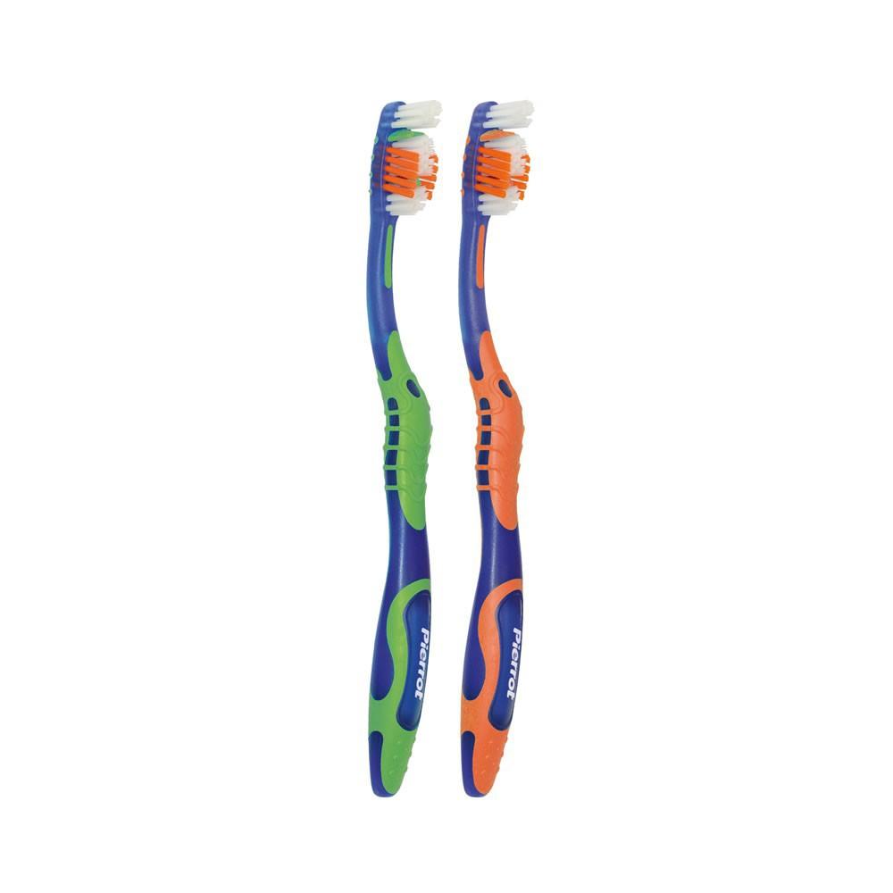 Bộ đôi bàn chải đánh răng Vàng siêu mềm Pierrot với đầu lông chải xiên linh hoạt có khả năng làm sạch sâu tận kẽ chân răng. Bàn chải có kèm dụng cụ làm sạch