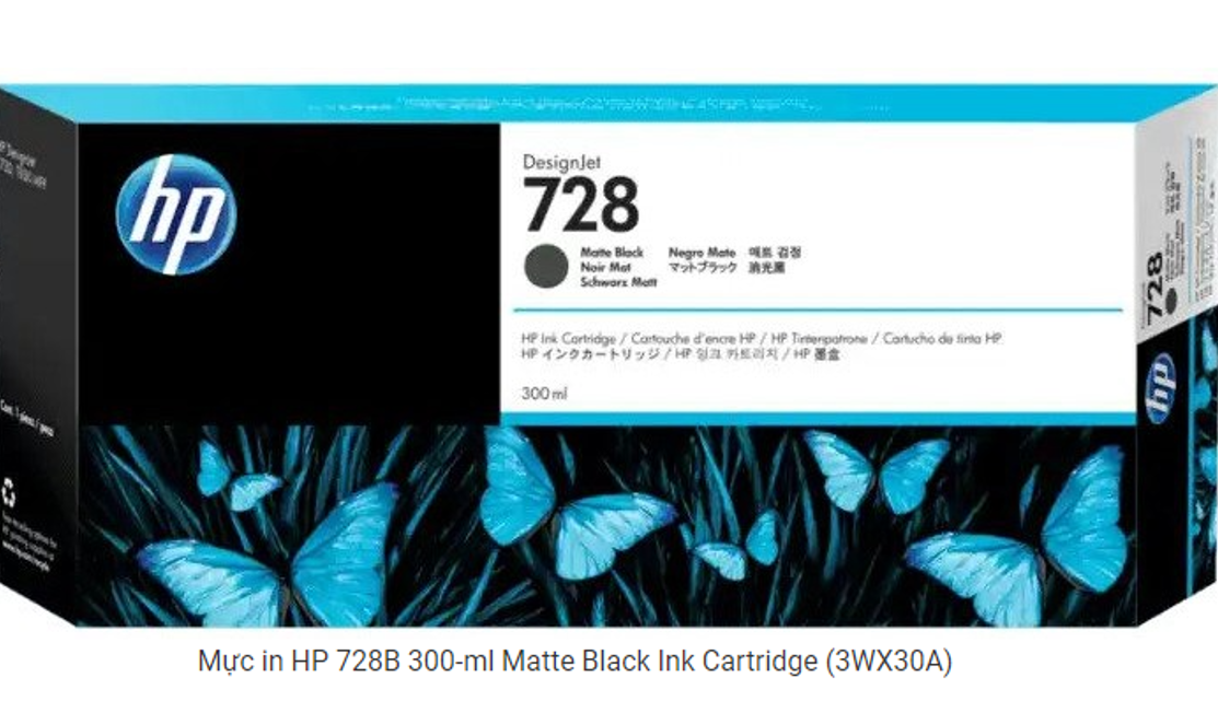 THÔNG TIN SẢN PHẨM: Mã mực: Mực in HP 728 300-ml Matte Black DesignJet Ink Cartridge (3WX30A) (Thay cho mã mực F9J68A) Loại mực: In phun màu đen Dung lượng: 300 ml Máy dùng: HP