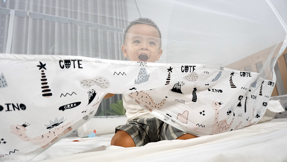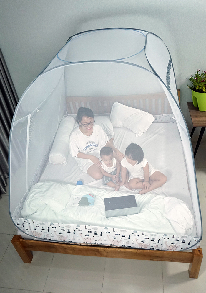 • Không gian sinh hoạt vui chơi cho bé và bố mẹ: Để con nhỏ chơi trong mùng chụp này, bố mẹ không phải lo lắng ngoài vấn đề MUỖI CẮN, mà còn giúp TRÁNH con BỊ TÉ khỏi giường. Mùng ôm sát nệm,có 4 dây chun cài rất chắn chắn