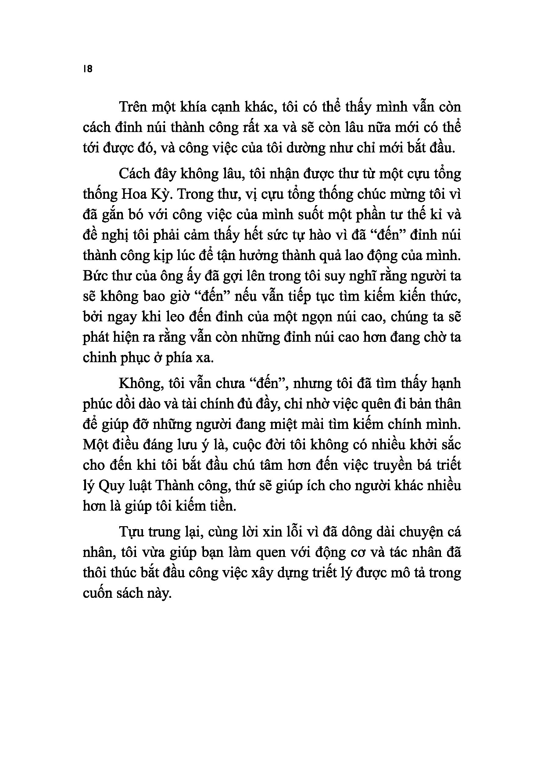 Có cả một kho báu tri thức được khai quật trong cuốn sách này. Napoleon Hill đưa ra một lộ trình ngắn gọn, chi tiết để đi lên nấc thang dẫn tới thành công, một bước tiến phụ thuộc vào việc tổ chức các quy trình tư duy của một người. Có lẽ đọc cuốn sách này, bạn sẽ tìm thấy một trong những thứ quan trọng để xoay chuyển cuộc đời mình sang hướng khác – hướng của một cuộc đời thành công, ví như: xác lập mục tiêu, bồi dưỡng sự tự tin, hình thành thói quen tiết kiệm, tạo dựng tính chủ động, tự chủ, phát huy khả năng tưởng tượng, giữ lửa nhiệt tình, giữ vững sự tập trung, xây dựng khả năng hợp tác, rút ra kinh nghiệm sau thất bại, khoan dung với mình và mọi ngườ