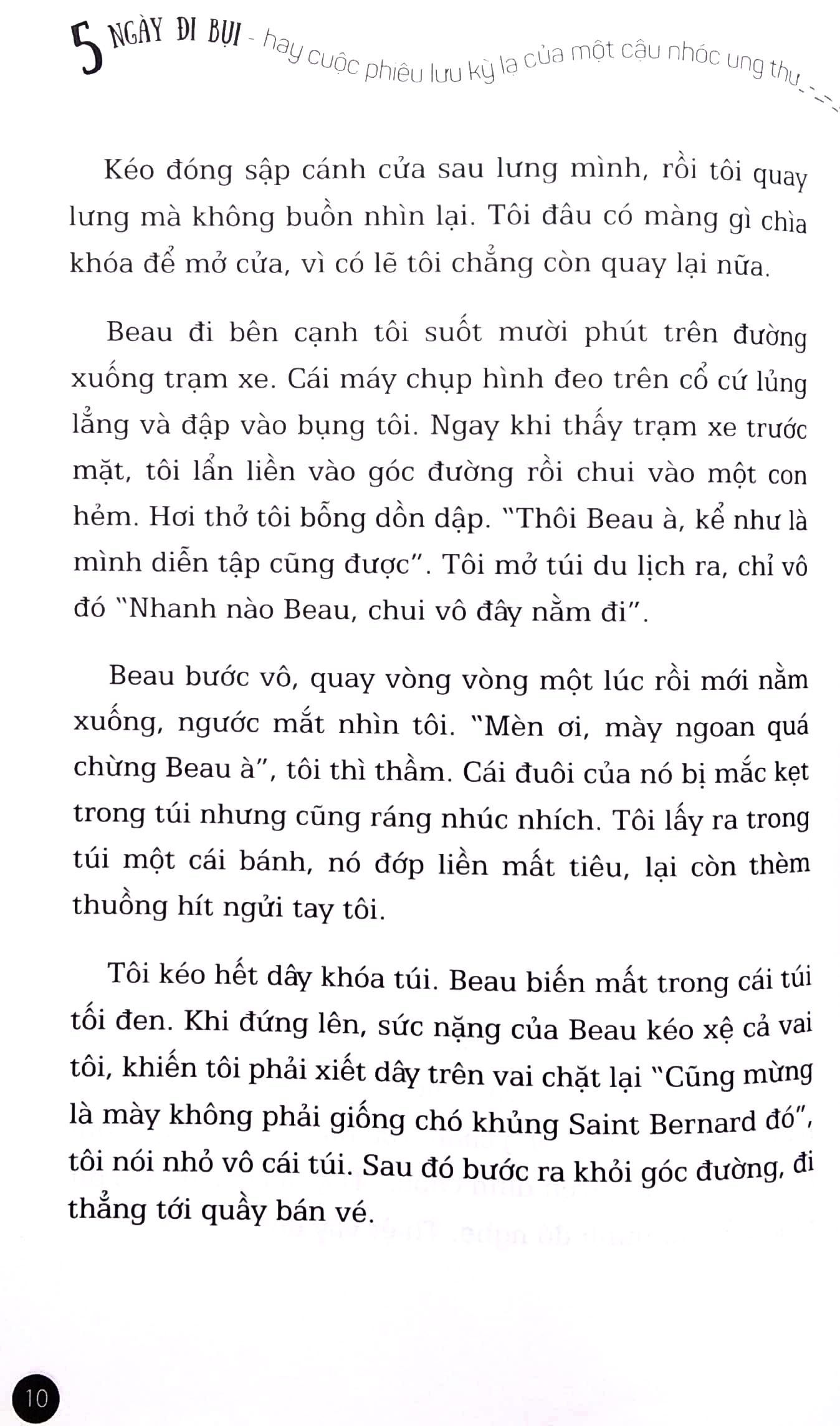Chuyến hành trình năm ngày của Mark và Beau bắt đầu. Suốt hơn 13 chương truyện là hành trình bỏ nhà đi với biết bao trải nghiệm dọc đường đi của Mark và chú chó Beau. Khởi đầu bằng cái mặt bị tẩn be bét bởi đám côn đồ ở Seattle. Thằng nhóc ốm yếu như Mark bị trấn lột sạch tiền và bỏ lại ở cái góc dơ bẩn đầy thùng rác và những thứ bỏ đi - cách mà Mark vẫn nhìn nhận về chính m.ình. Rồi những khi bị nước sông siết lạnh cuốn trôi mà cả nó và Beau trong tích tắc đã bước qua thế giới bên kia. Những lần chui lủi, trốn vé xe, tàu, nói dối cảnh sát và qua mặt "đám người lớn phức tạp". Mark đã làm được nhiều hơn bất cứ một người bình thường nào chứ chưa nói đến một đứa nhóc lớp 8 dặt dẹo. Nhưng quan trọng hơn cả, suốt dọc đường đi, Mark nhận thêm tình yêu thương từ những con người tốt bụng chẳng quen xung quanh. Tình yêu thấm đượm trong bọc thức ăn của những người phụ nữ nấu bếp người Mexico, cái nháy mắt cười tinh anh của cô bé "nói huyên thuyên không ngừng" trên chuyến xe buýt đến Wenatchee và cả ông chú cho Mark đi nhờ trên đường ngược bão tuyết lên núi. Mark đã không cưỡng được mà mở lòng với những con người nhỏ bé nhưng ấm nóng tình thương người đó, để nghe và hiểu câu chuyện của họ. Rồi thằng bé nhận ra nó không một m.ình. Mặc cho sự cứng đầu cố chấp và trái tim như đang mất dần niềm tin vào cuộc sống khi từng cơn đau cứ dộng từng nhịp trong cái đầu trọc trơ của nó, Mark có thêm động lực để hoàn thành chuyến đi nó hằng mong ước.