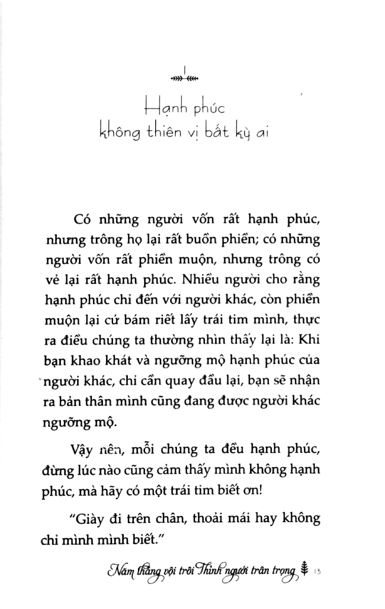 Với hơn 80 câu chuyện với 5 chương chính: Hạnh phúc là một dãy mật mã đơn giản nhưng đặc biệt; Quyền lựa chọn vui vẻ, chưa bao giờ nằm trong tay người khác; Tình yêu chân thành là cơ duyên hiếm có trên thế gian; Bởi thế giới này không có sự vĩnh hằng; Thứ quý giá nhất trên thế gian là gì?